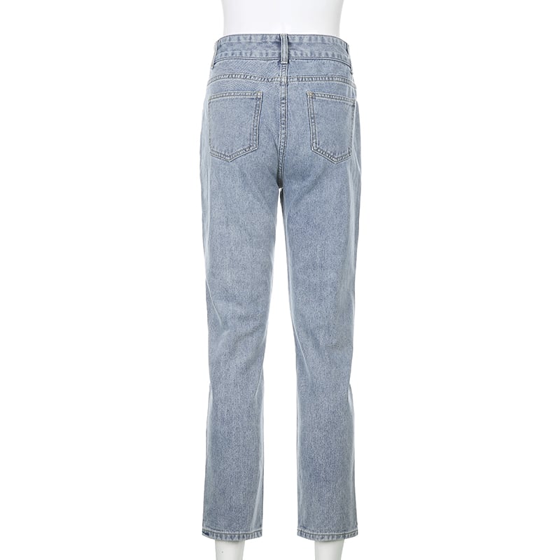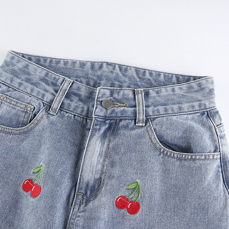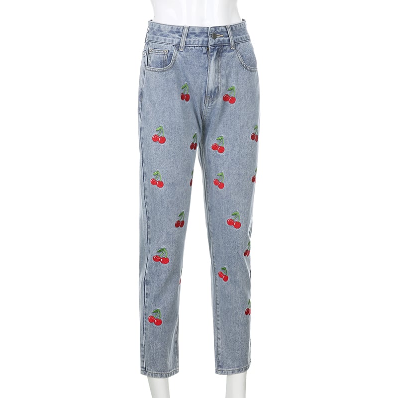 Cute Sweet Vintage Cherry Embroidery Light Washed Blue Denim Jeans High Waisted Cargo Slim Bottom E-Girl Kawaii Korean Japanese Harajuku Streetwear
