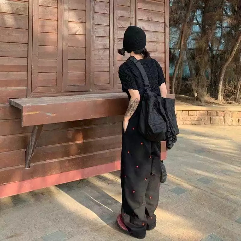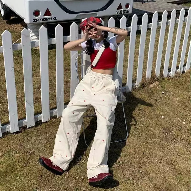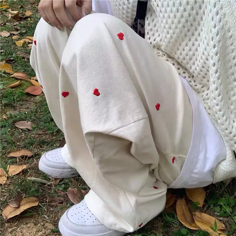 Cute Beige Love Hearts Wide Leg Pants Trouser Bottoms Aesthetic Casual Summer E-Girl Kawaii Korean Japanese Harajuku
