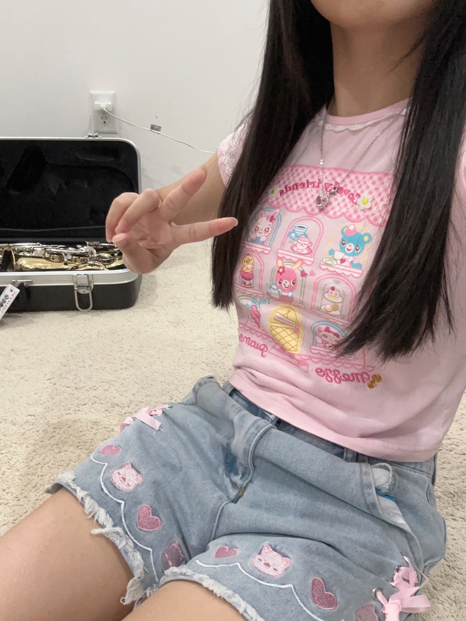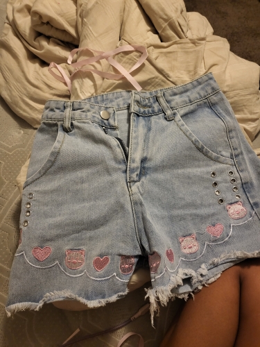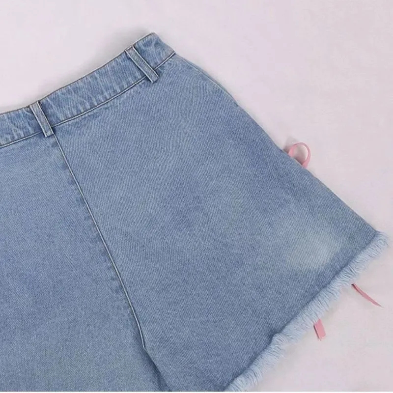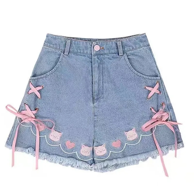 Cat Embroidery Pink Ribbon Denim Shorts