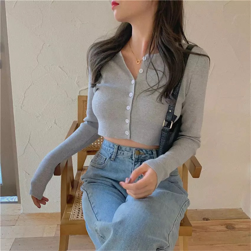 Cute Vintage O Neck Button Down Knit Cardigan Crop Top Sweater Sweatshirt Pullover Jumper E-Girl Kawaii Korean Japanese Harajuku Streetwear