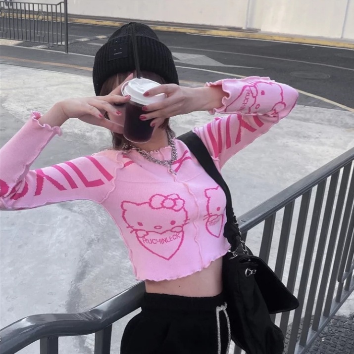 Cute Pink Kitty Cat Knit Loose Frill Long Sleeve Shirt Sweater Pullover Cardigan Aesthetic Casual Summer E-Girl Kawaii Korean Japanese Harajuku