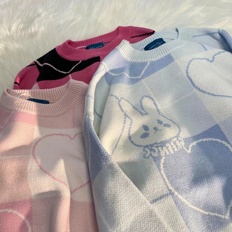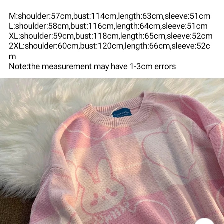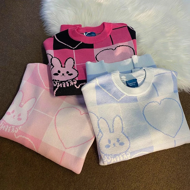 Cute Pink Bunny Rabbit Cartoon Knit Sweater Long Sleeve Pullover Jumper Aesthetic Casual E-Girl Kawaii Korean Japanese Harajuku