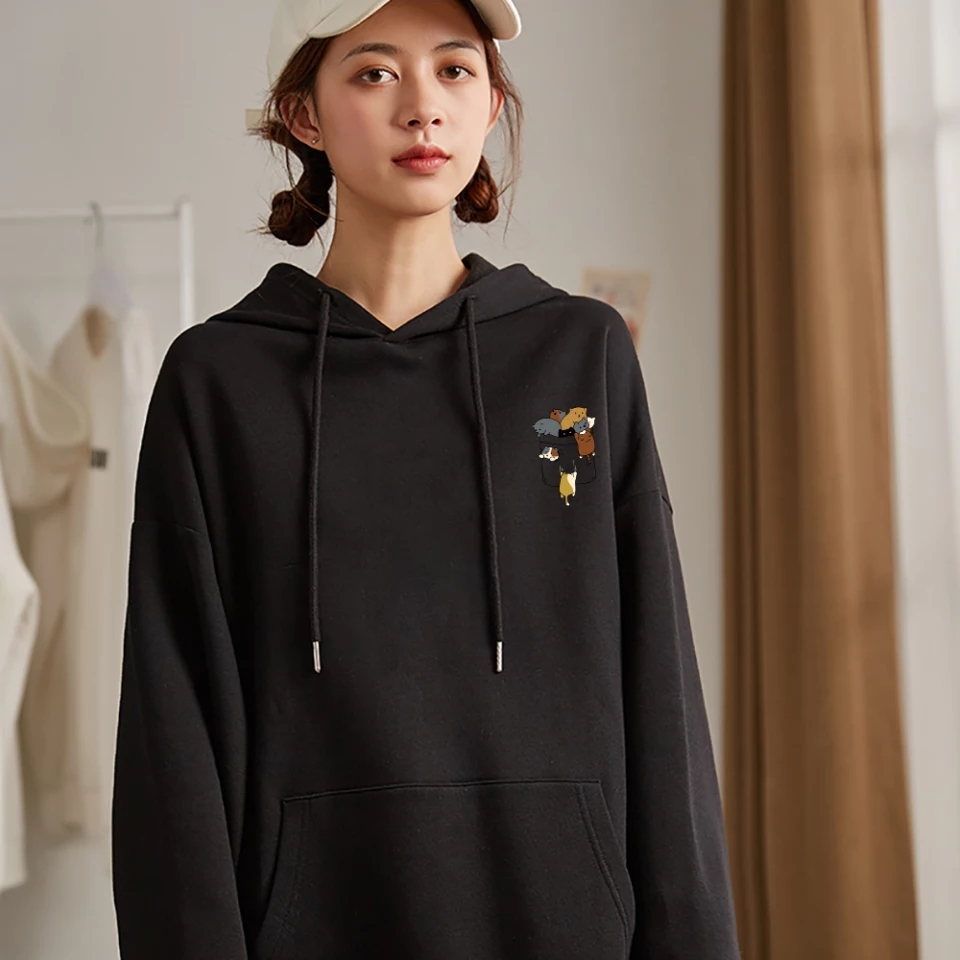 Cute Cat Cartoon Pocket Print Loose Fleece Hoodie Crewneck Pullover Sweatshirt Aesthetic Casual E-Girl Kawaii Korean Japanese Harajuku