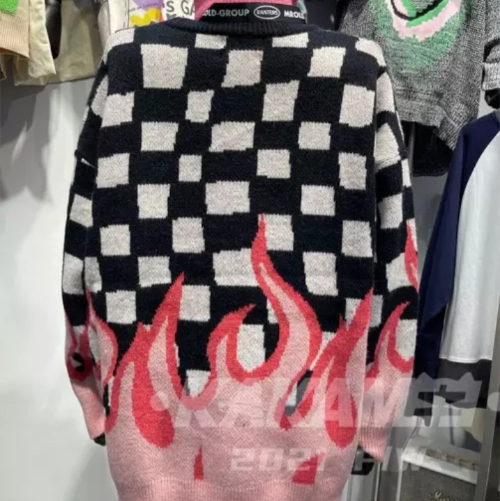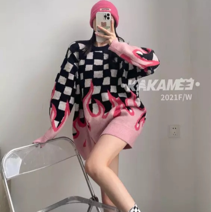Cute Hot Pink Flames Fire Checkerboard Plaid Oversized Knit Sweater Pullover Aesthetic Casual E-Girl Kawaii Korean Japanese Harajuku