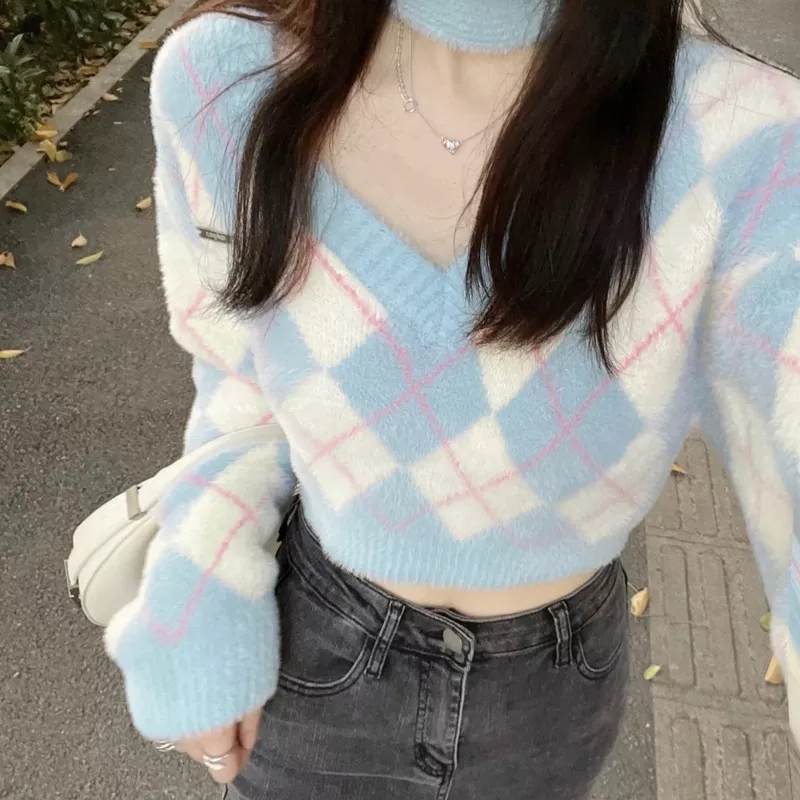 Blue Argyle Slash Neck Long Sleeve Sweater