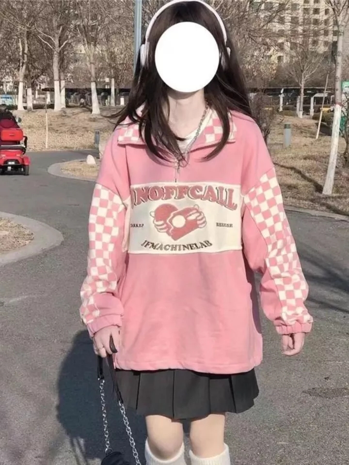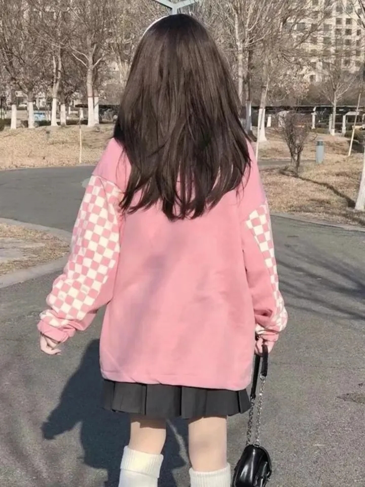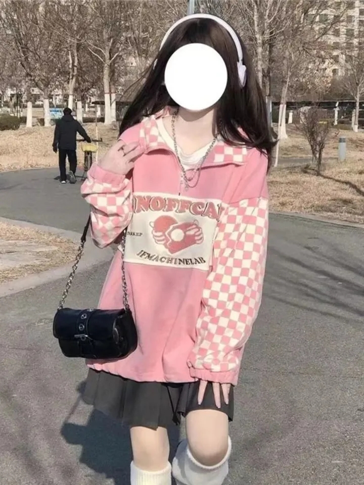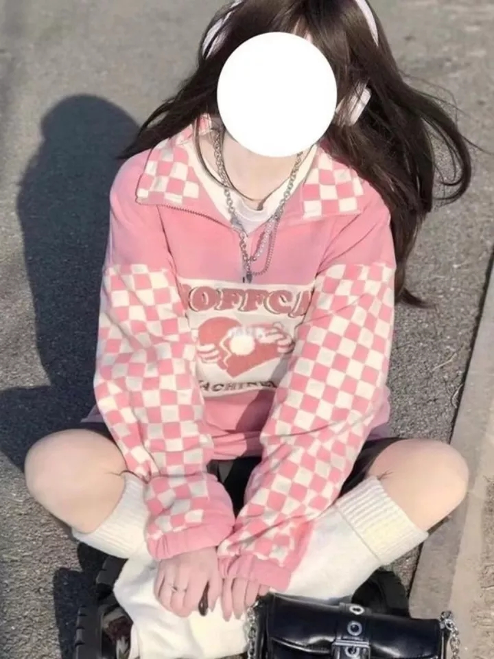 Pink Plaid Checkboard Zip Up Oversized Sweatshirt