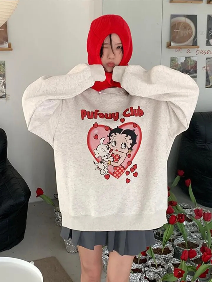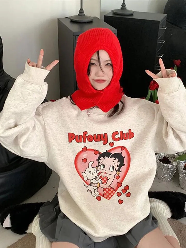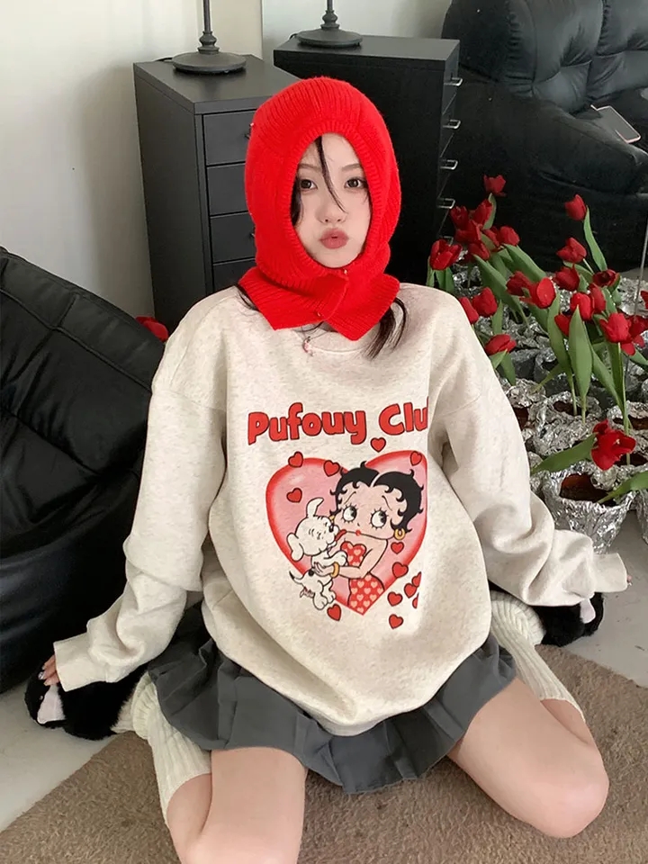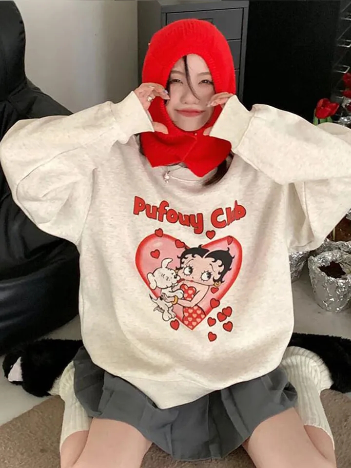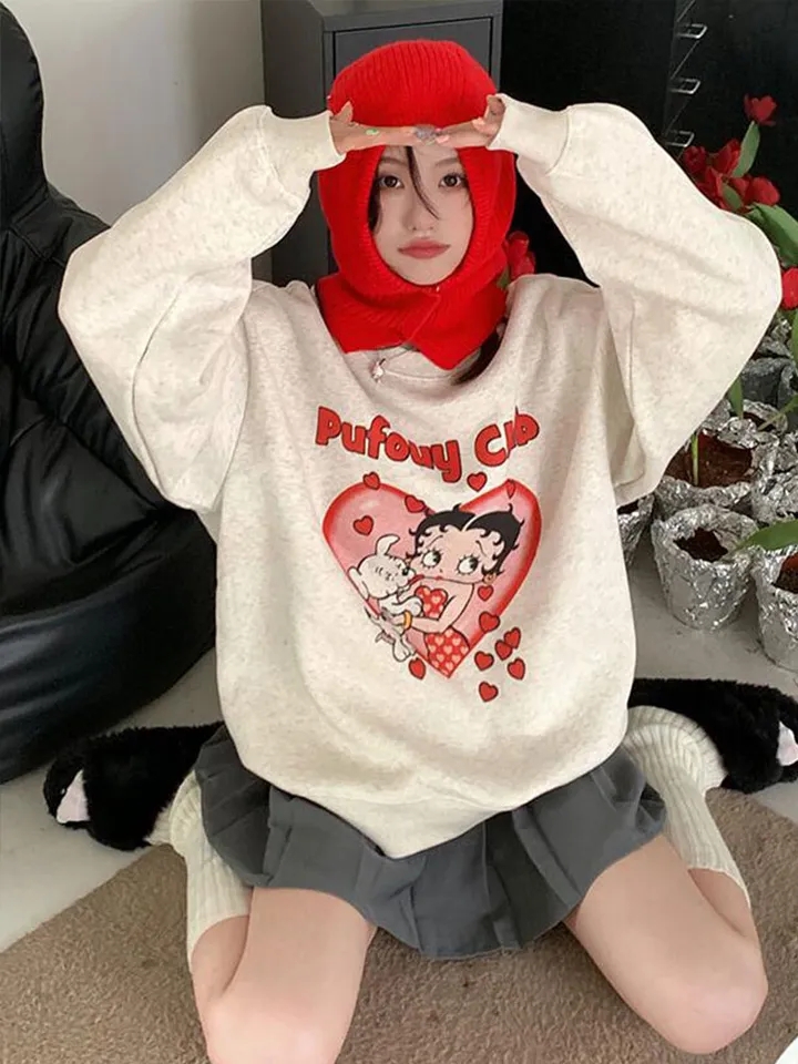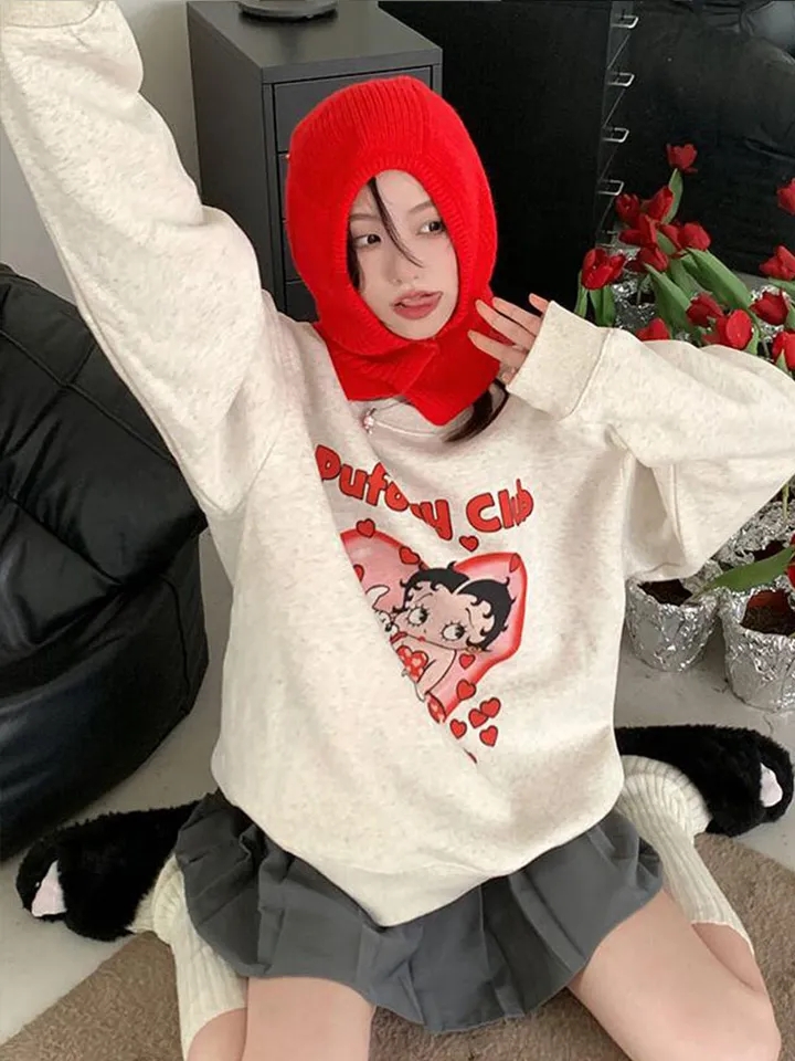 Anime Girl Cartoon Print Graphic White long Sleeve Hoodie Sweater Sweatshirt Pullover Top E-Girl Kawaii Korean Japanese Harajuku Streetwear