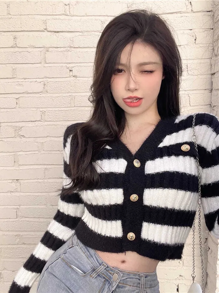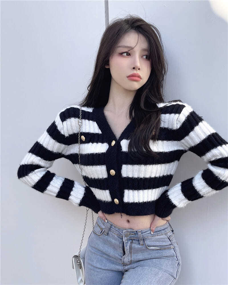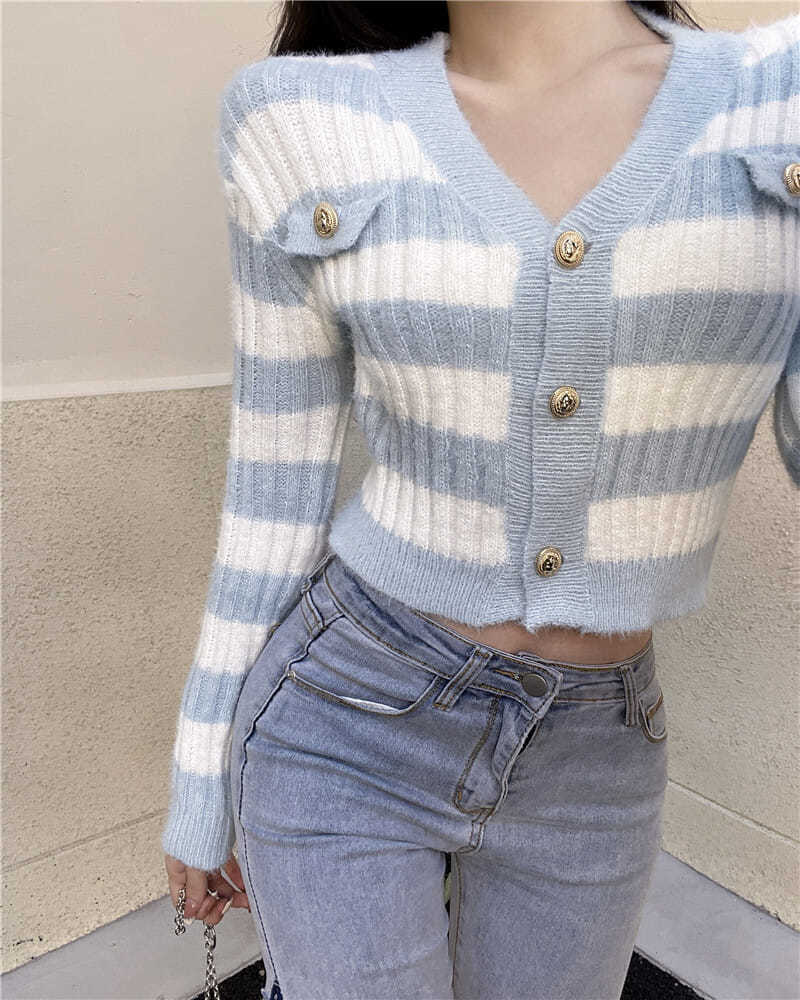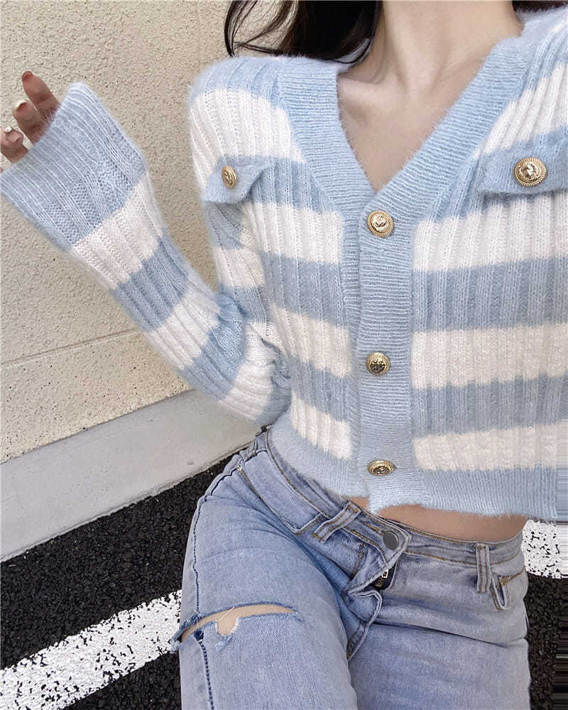 Blue & White Stripe Gold Button Sweater