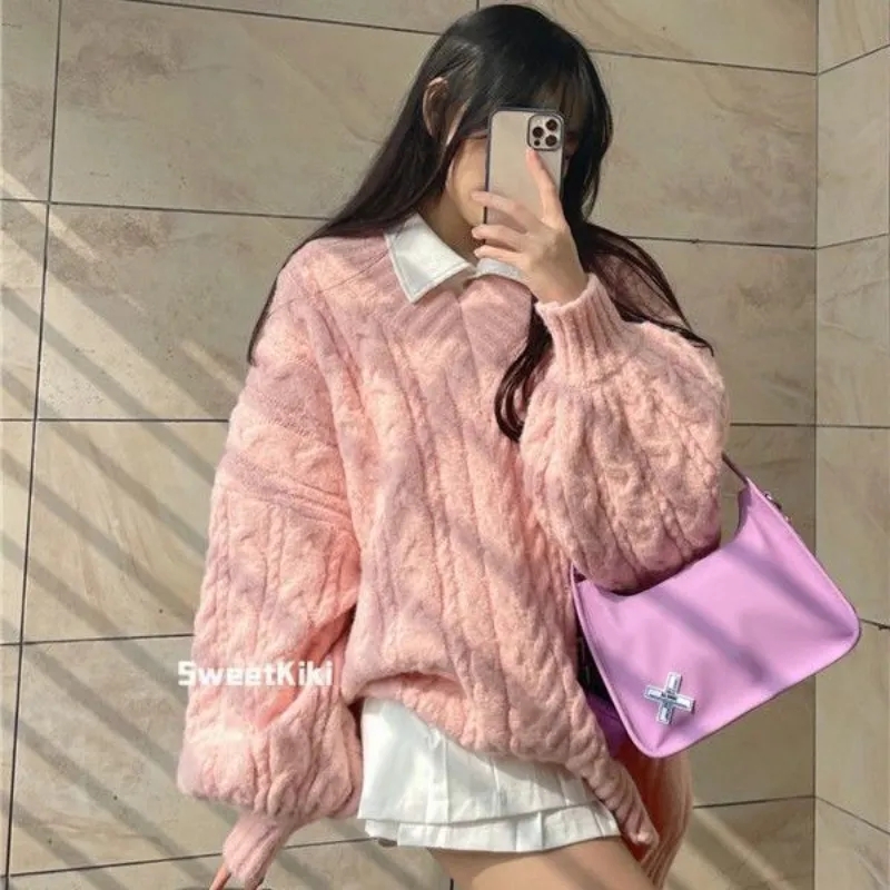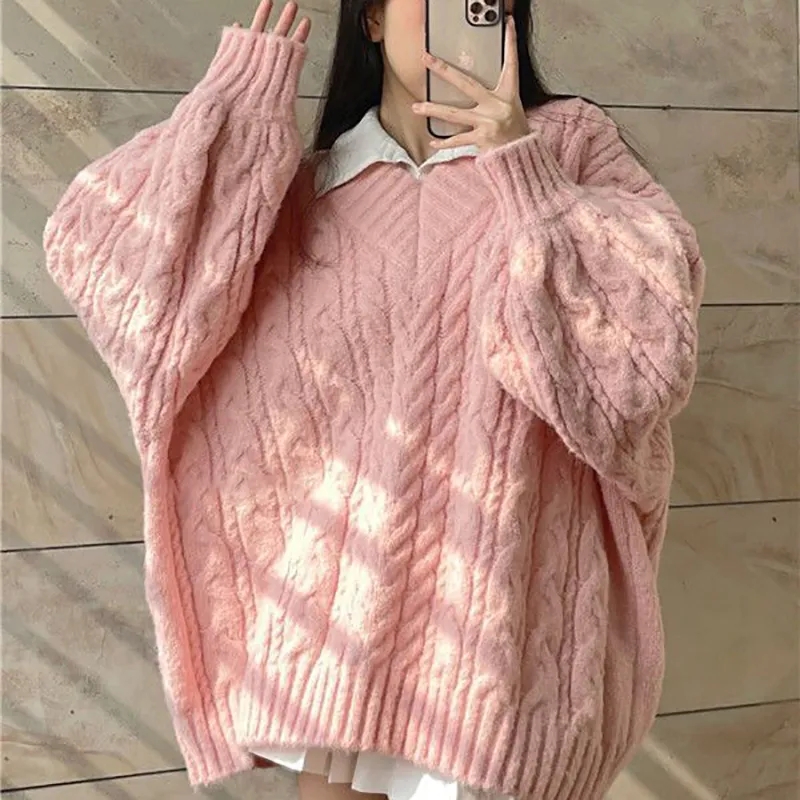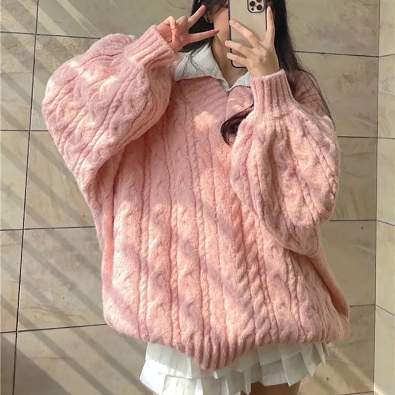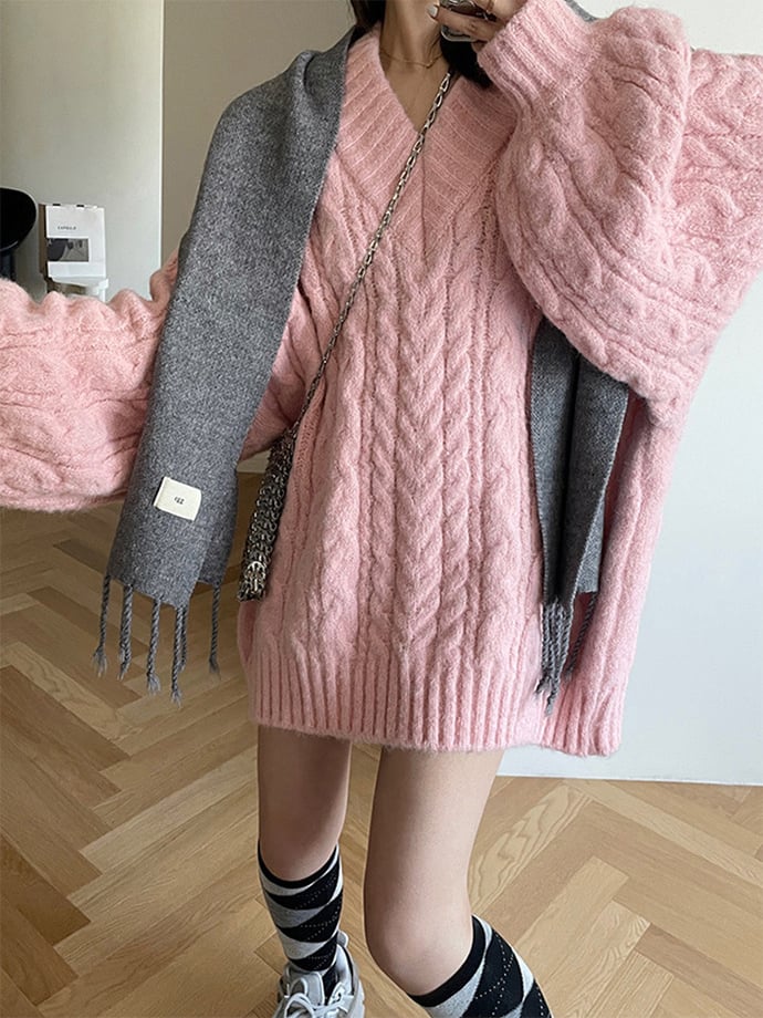 Pink Preppy Cable Knit V Neck Sweater