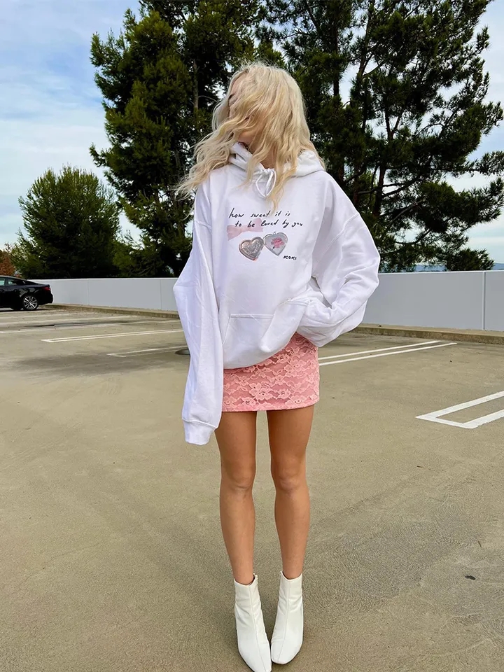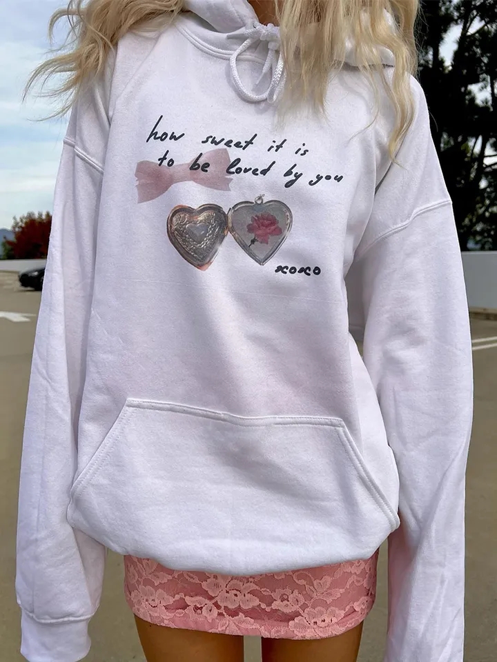 Sweet White Heart Locket Print Hoodie