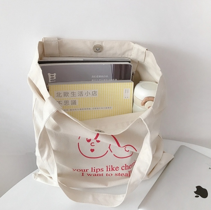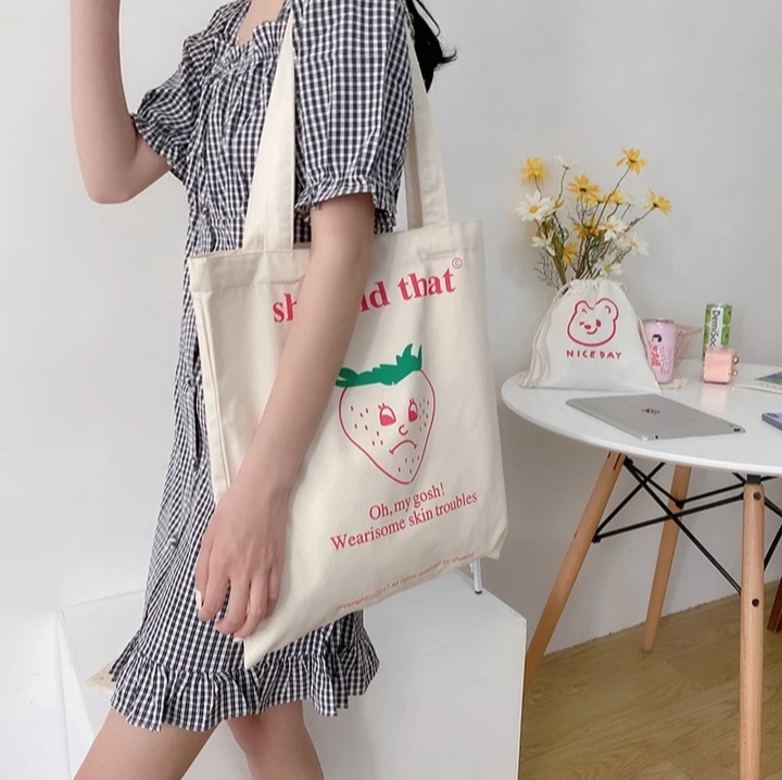 Cute Strawberry Cherry Print Canvas Tote Bag Eco Shopping Shoulder Bag Aesthetic Casual Summer E-Girl Kawaii Korean Japanese Harajuku