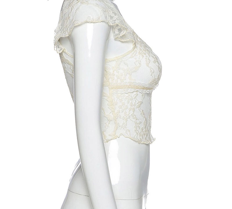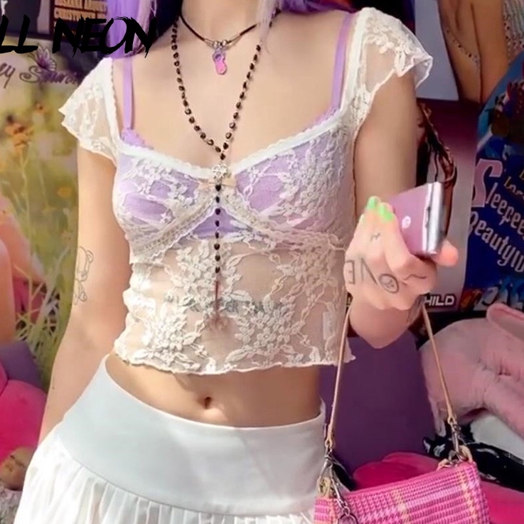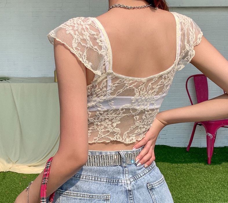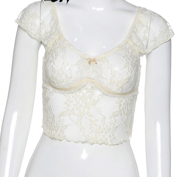 Cute Transparent Lace Mesh Sweet Crop Top Short Sleeve Shirt Tee T-shirt E-Girl Kawaii Korean Japanese Harajuku Chinese Retro Streetwear Aesthetic