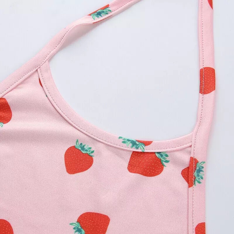 Cute Pink Strawberry Print Crop Top Camisole Spaghetti Strap Tank Shirt Tee T-shirt E-Girl Kawaii Korean Japanese Harajuku Retro Streetwear Aesthetic