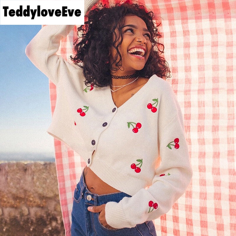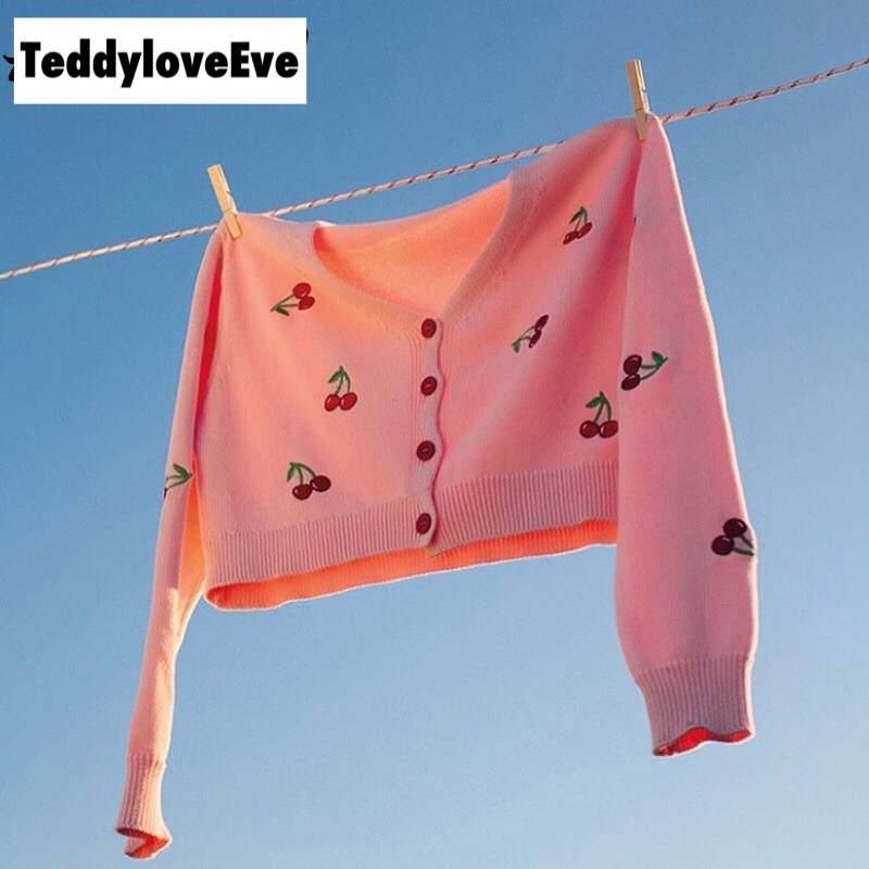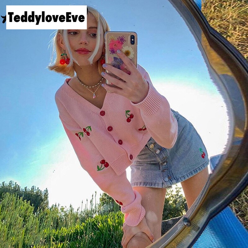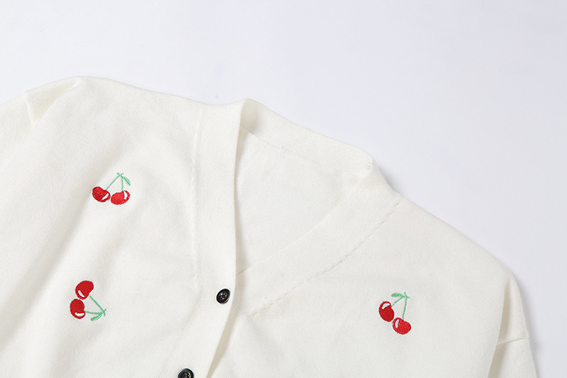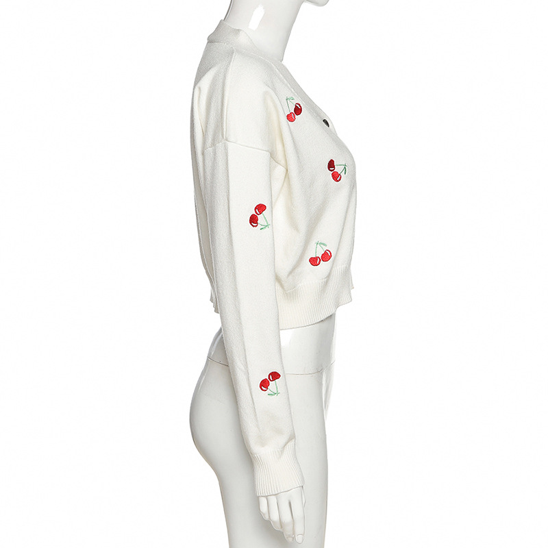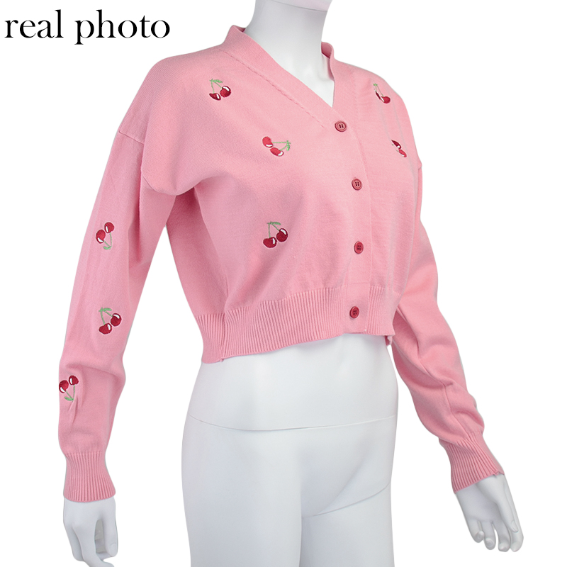 Cute Sweet Cherry Embroidery V Neck Knit Vest Long Sleeve Cardigan Crop Top Sweater Sweatshirt Pullover Jumper E-Girl Kawaii Korean Japanese Harajuku