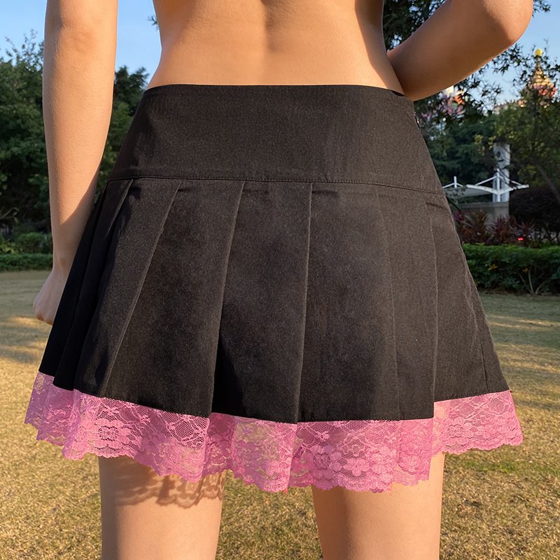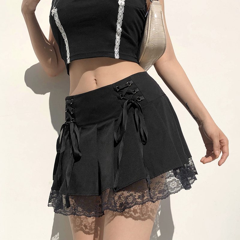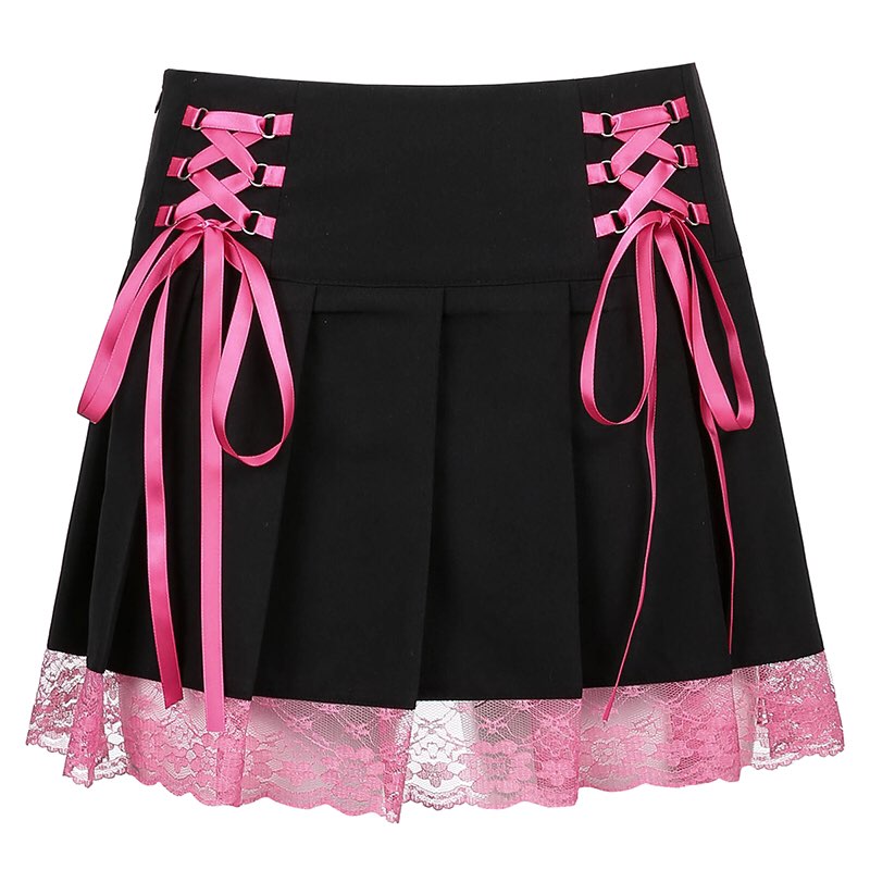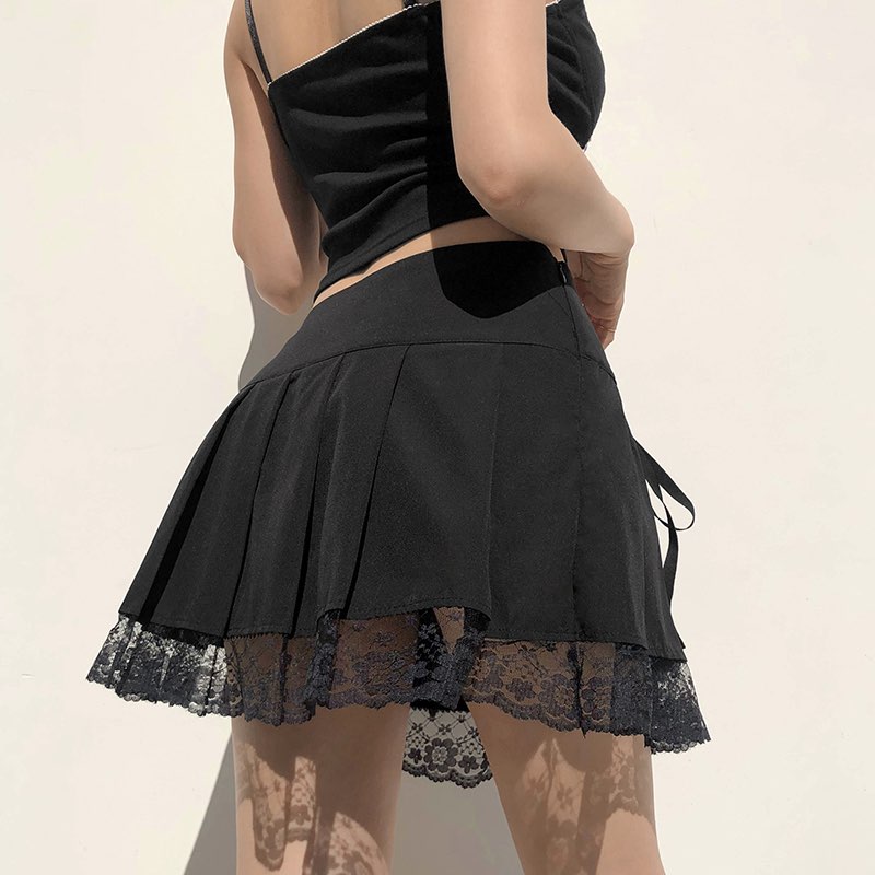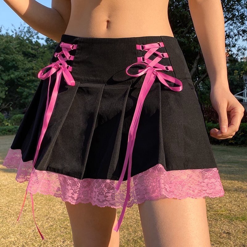 Cute Vintage Lace Trim Ribbon Bow Tie Up Pleated High Waisted Skirt Punk Goth E-Girl Kawaii Korean Japanese Harajuku Streetwear