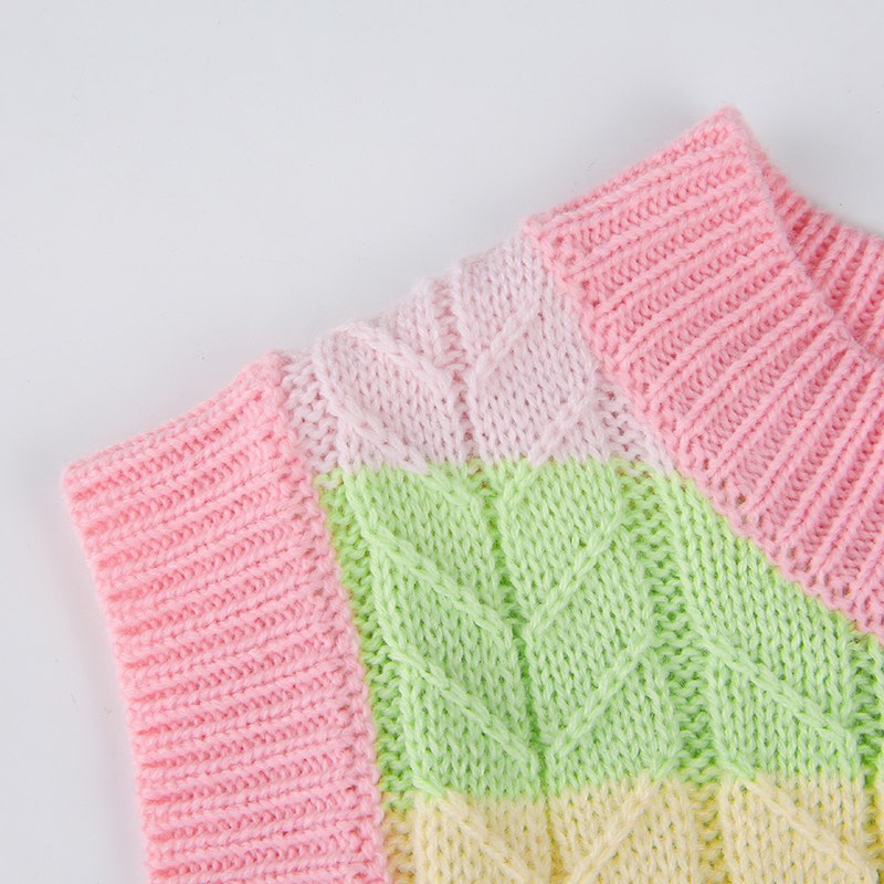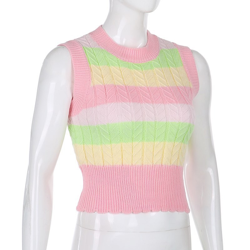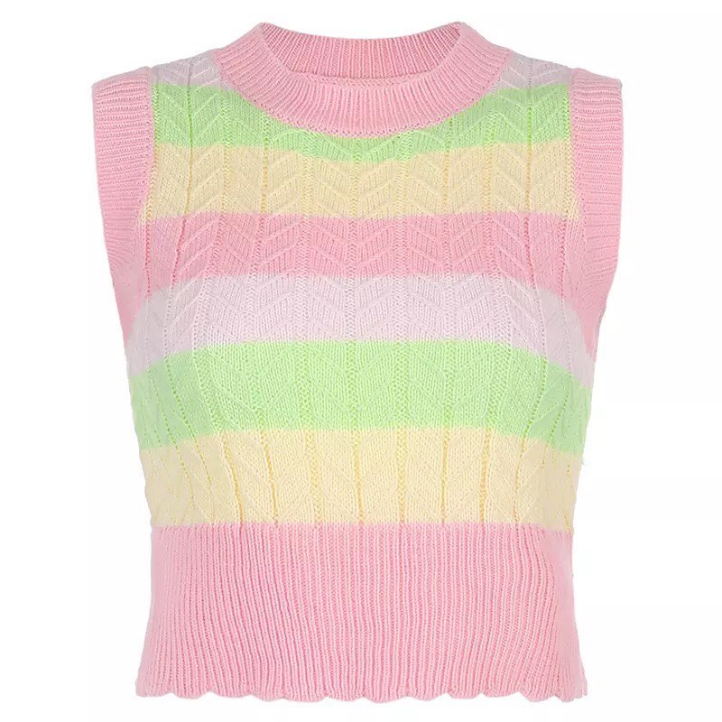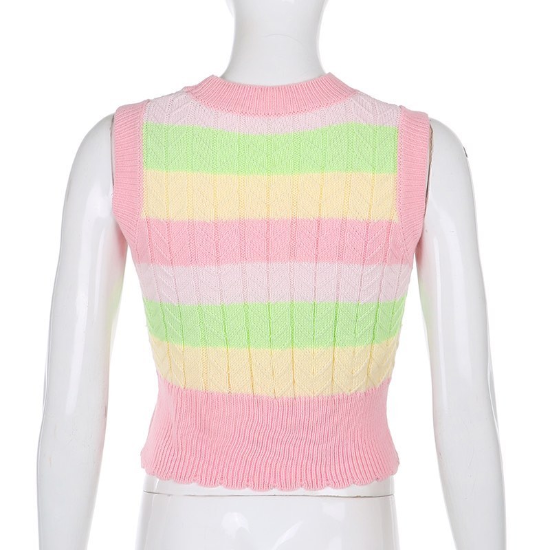 Cute Pink Rainbow Stripe Tie Dye Sleeveless V Neck Knit Vest Sweater Top Pullover Autumn Aesthetic E-Girl Kawaii Korean Japanese Harajuku Streetwear
