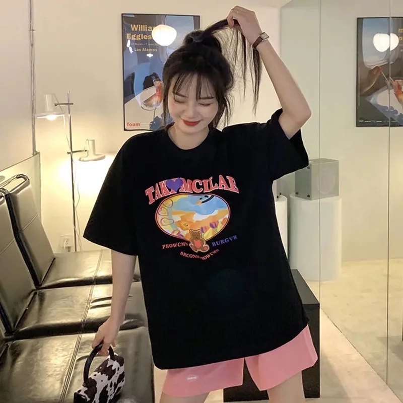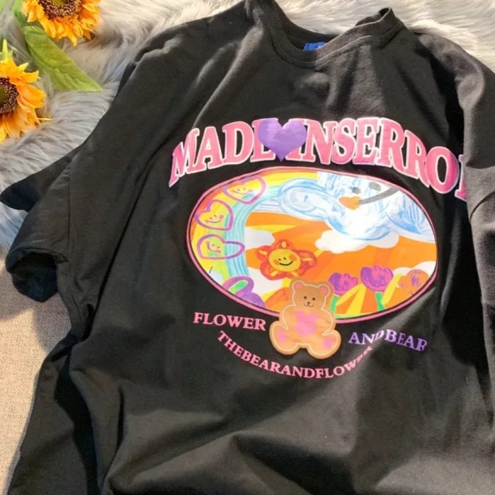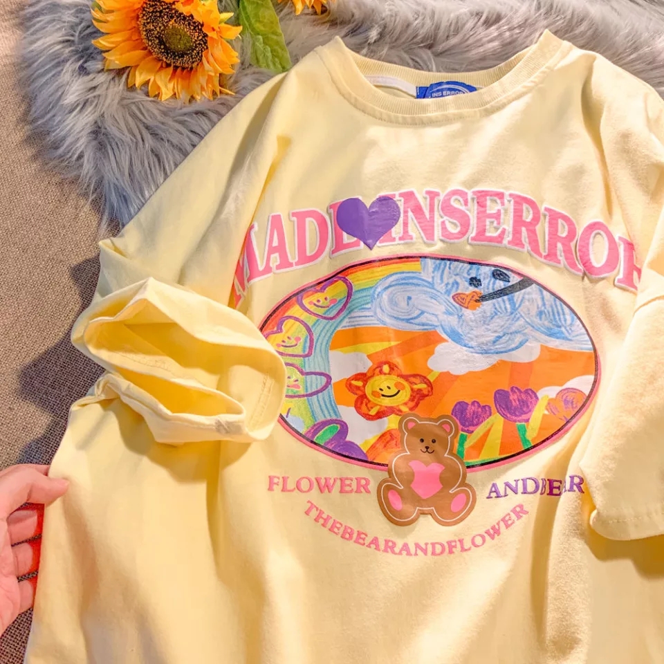 Cute Sweet Graffiti Bear Letter Print Short Sleeve Shirt Top Loose Oversize Aesthetic Casual Summer E-Girl Kawaii Korean Japanese Harajuku