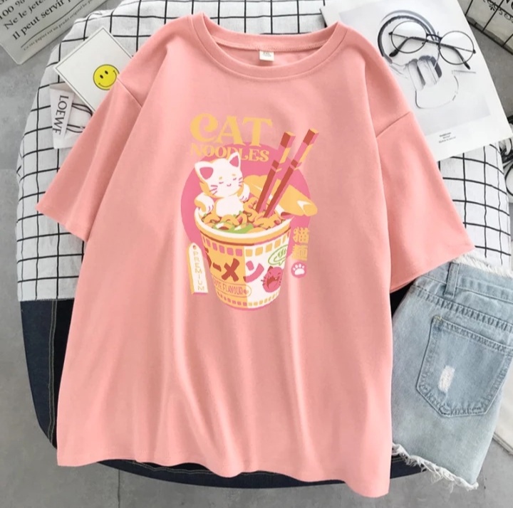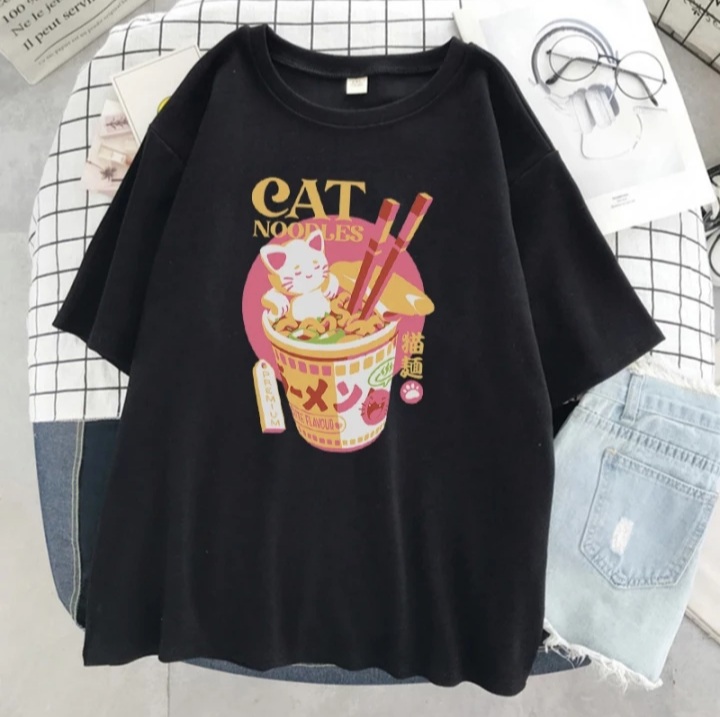 Cute Cat Noodle Ramen Graphic Cartoon Print Loose Short Sleeve T-shirt Aesthetic Casual Summer E-Girl Kawaii Korean Japanese Harajuku