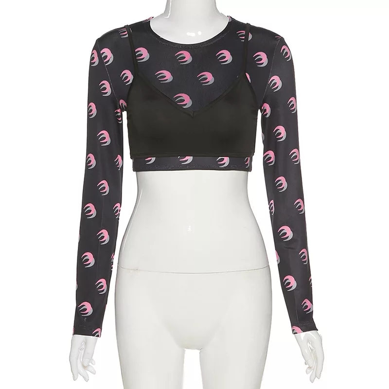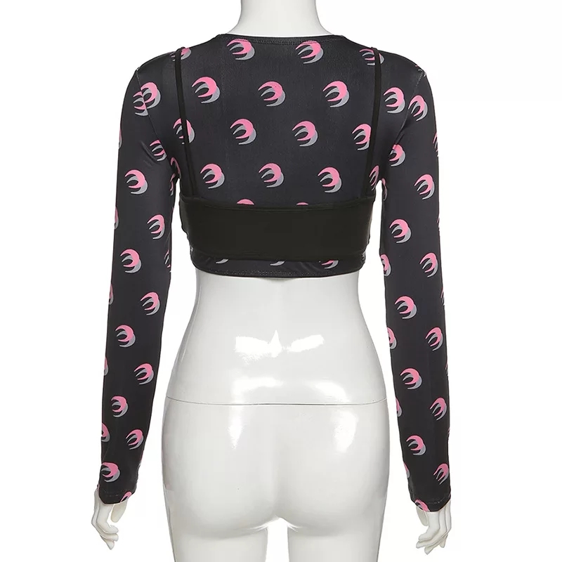 Cute Sexy 2pcs Moon Print Long Sleeve T-shirt Crop Top With Bra Camisole Summer Aesthetic Casual E-Girl Kawaii Korean Japanese Harajuku