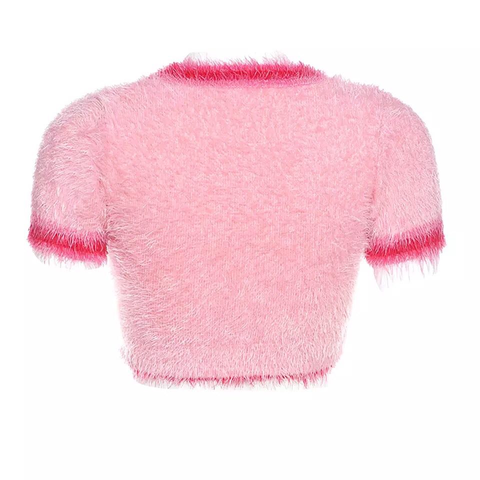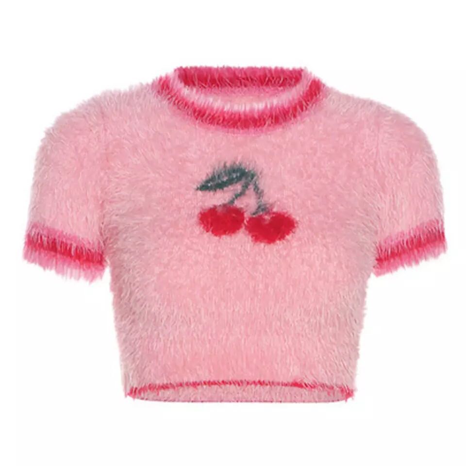 Pink Cherry Fluffy Soft Short Sleeve Shirt Crop Top Summer Aesthetic Casual E-Girl Kawaii Korean Japanese Harajuku