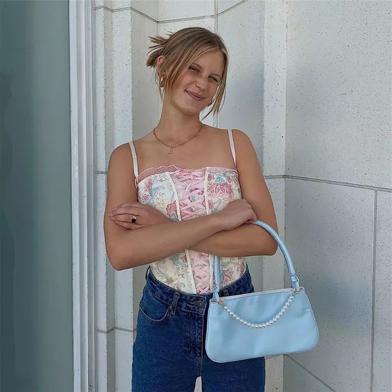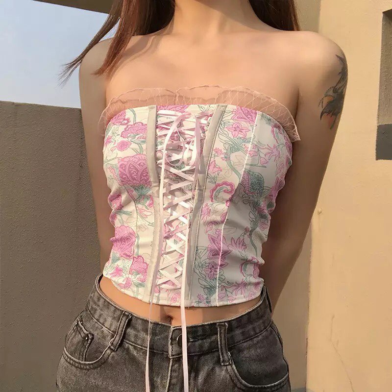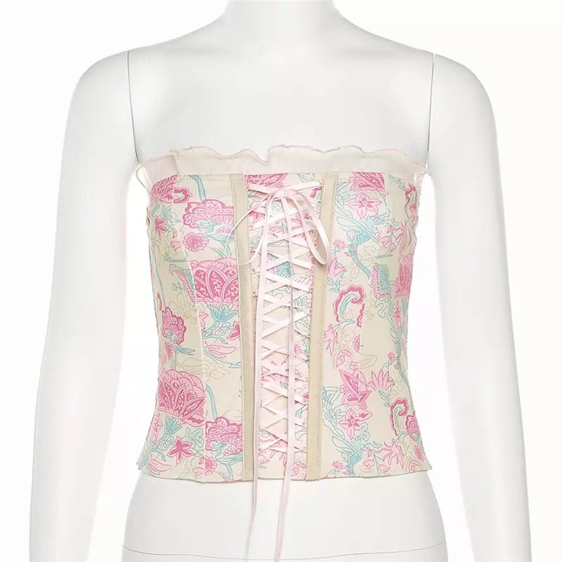 Pink Floral Print Corset Bandage Bustier Crop Top Sleeveless Shirt Summer Aesthetic Casual E-Girl Kawaii Korean Japanese Harajuku