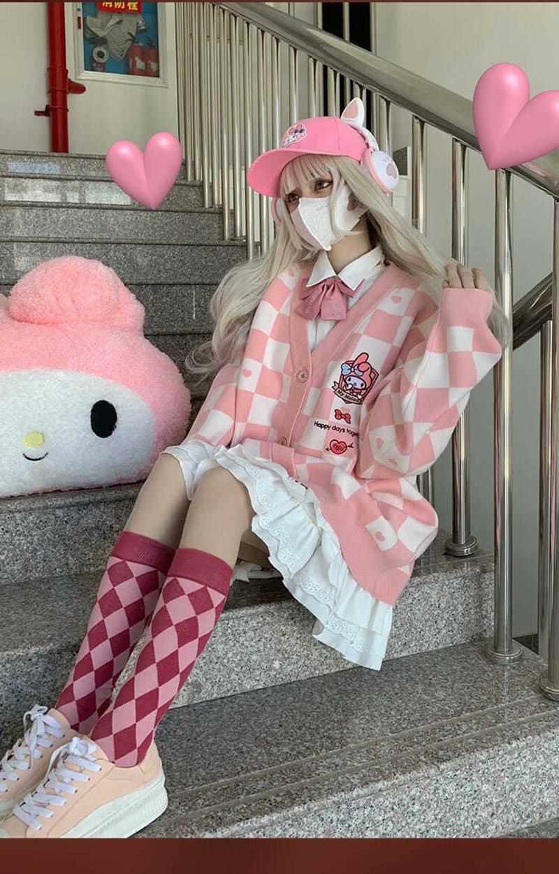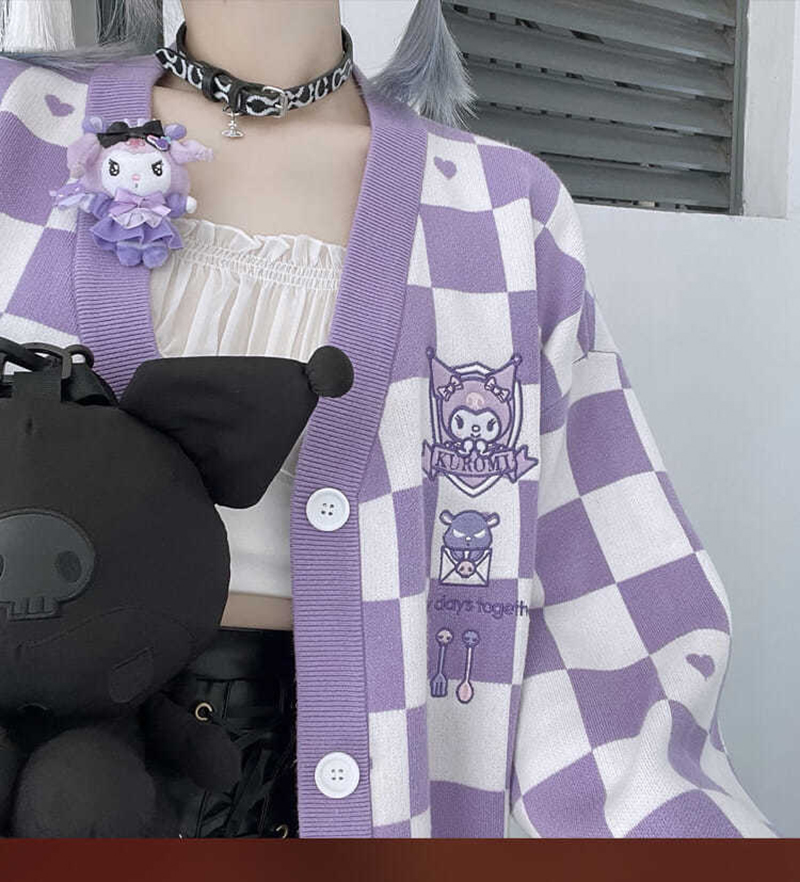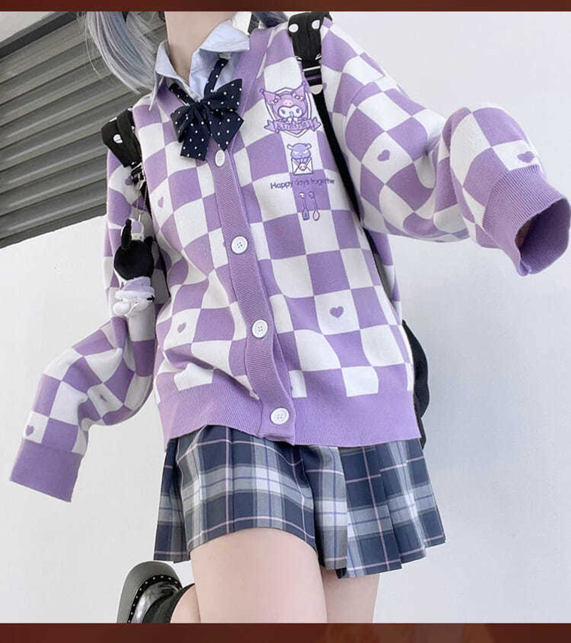 Japanese Anime Embroidery Checkboard Sweater