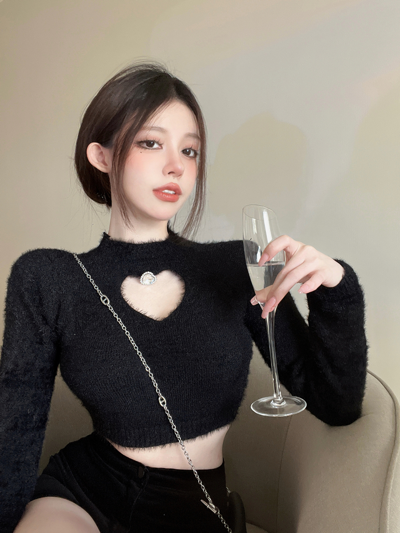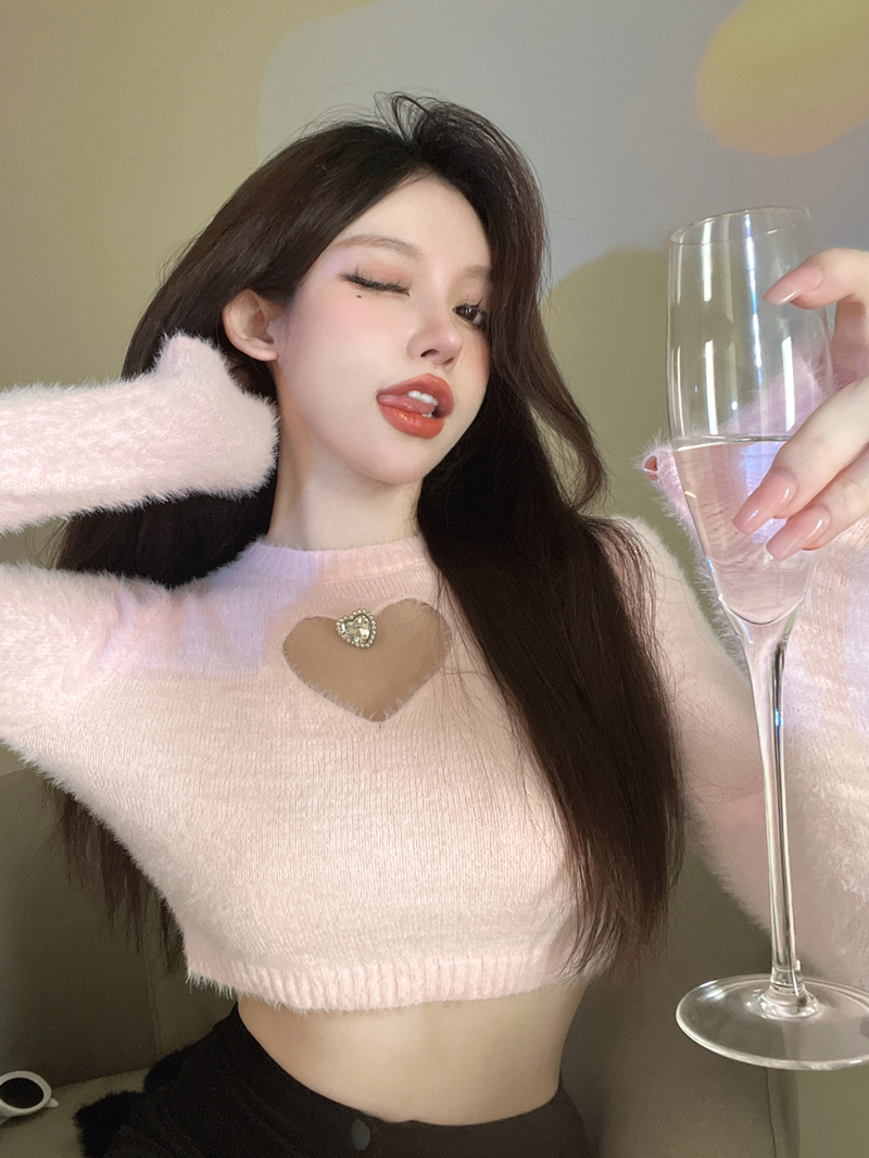 Heart Hollow Out Crystal Stud Long Sleeve Top