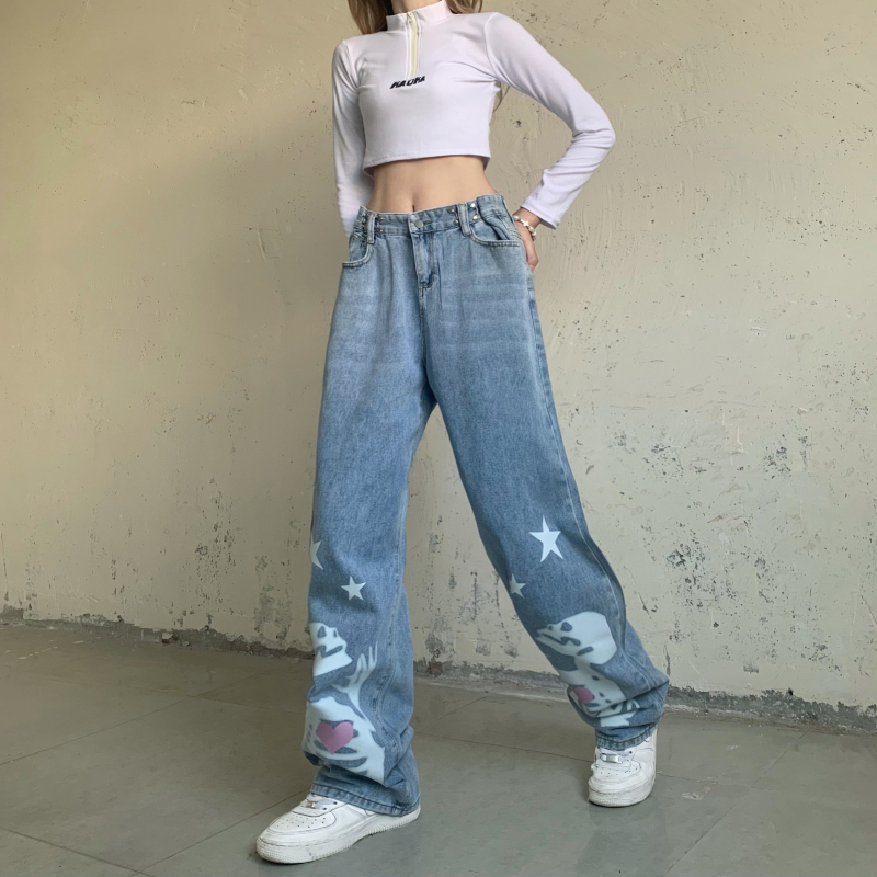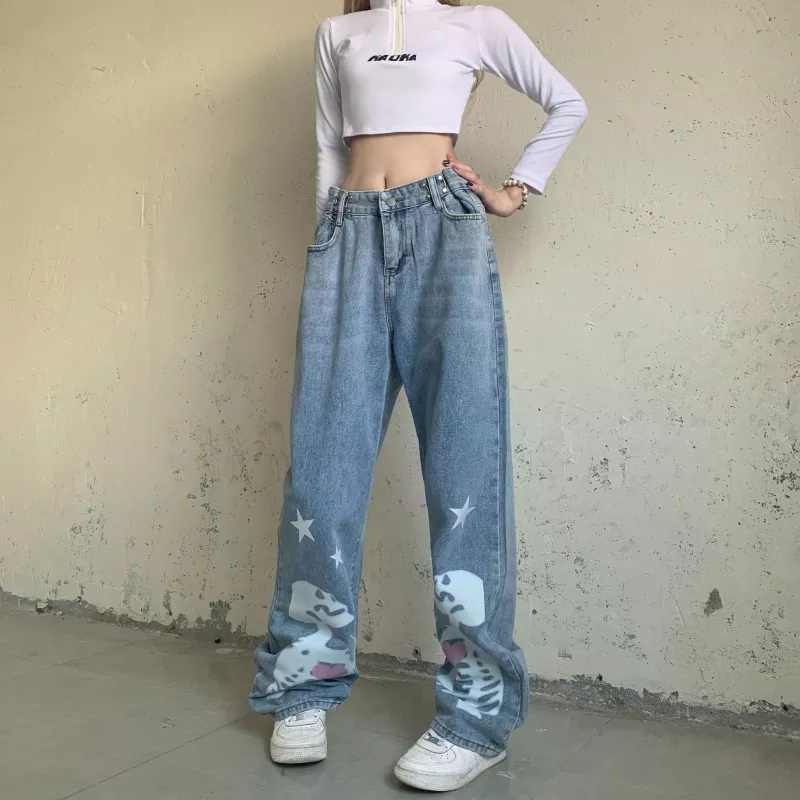 Blue Skull Print Denim Straight Leg Jeans