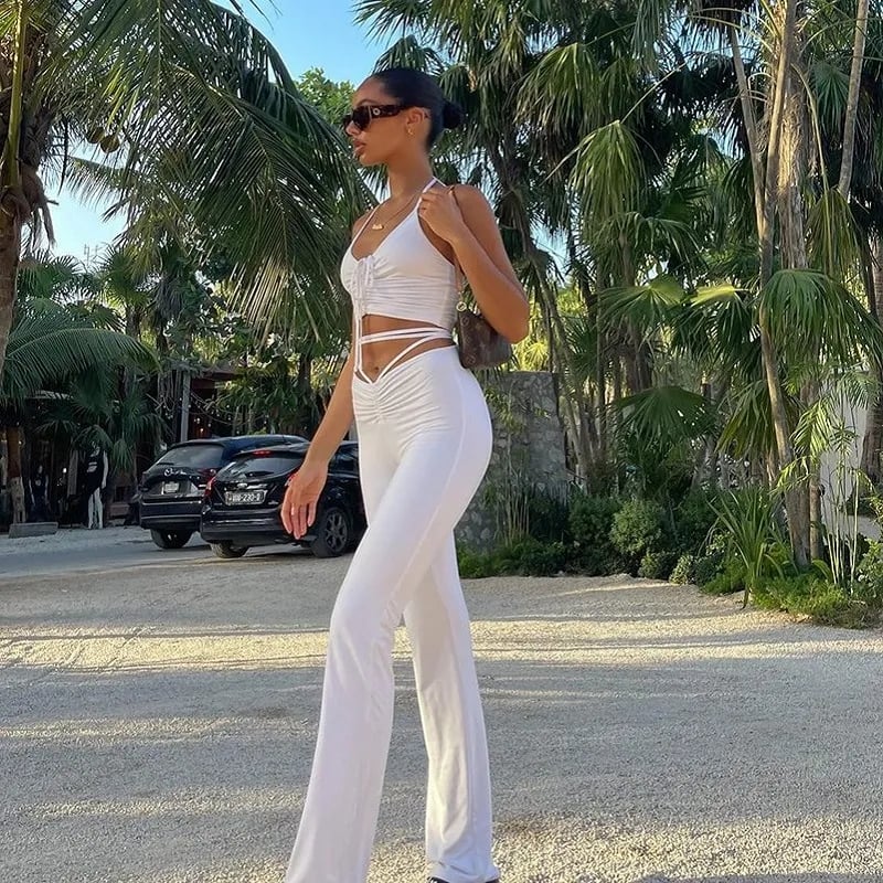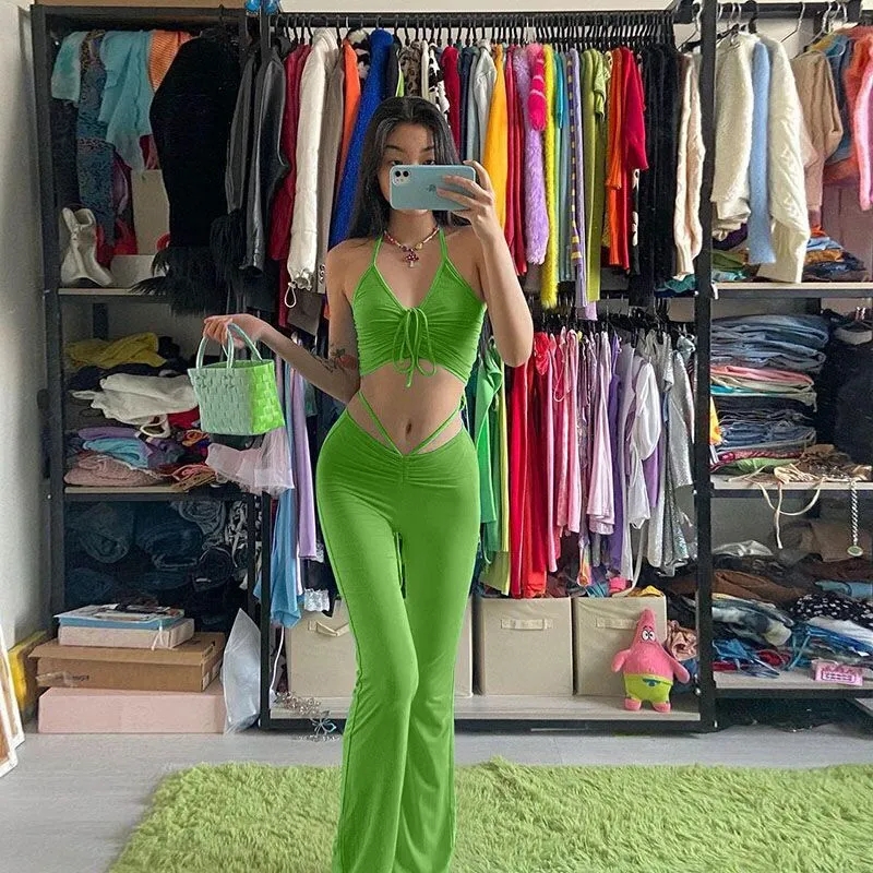 2PCS Blue Bandage Drawstring Halter Top + Flare Pants