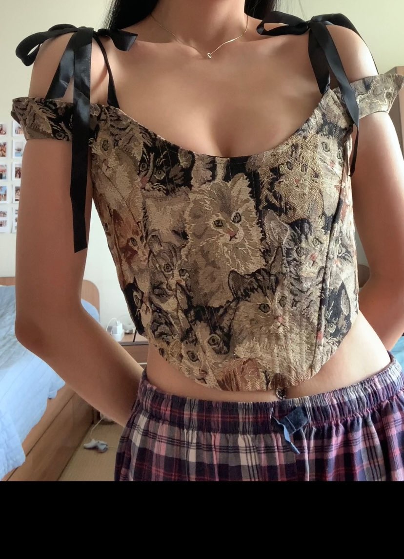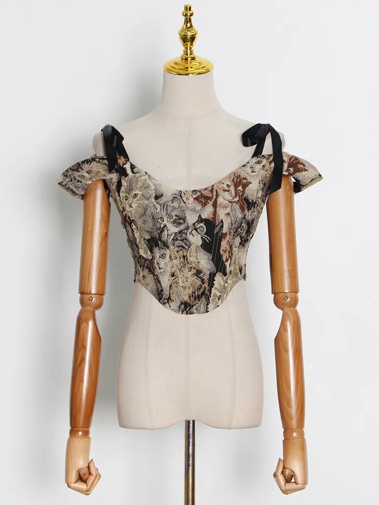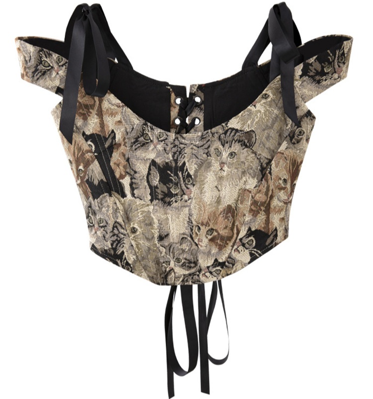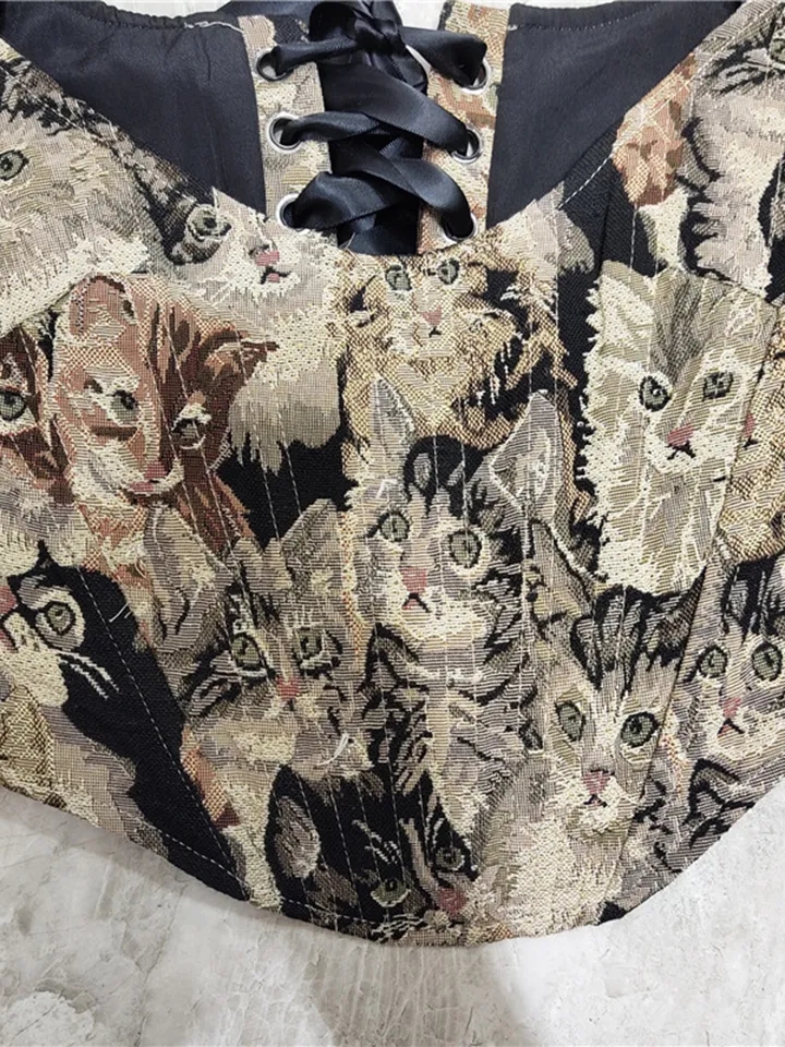 Cat Embroidery Lace Up Corset Top