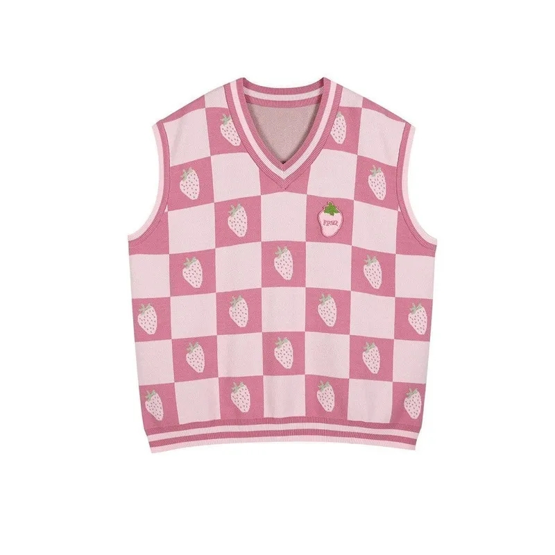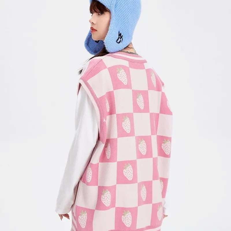 Pink Strawberry Plaid Sweater Vest