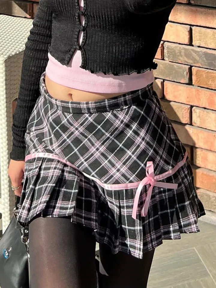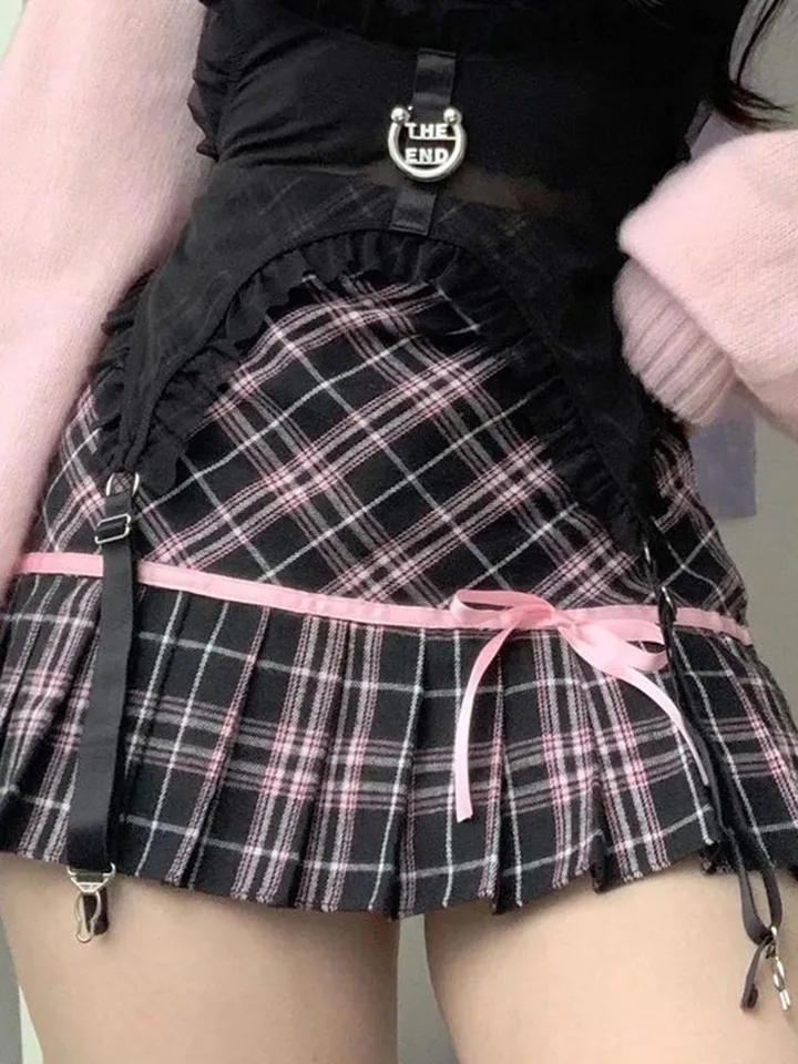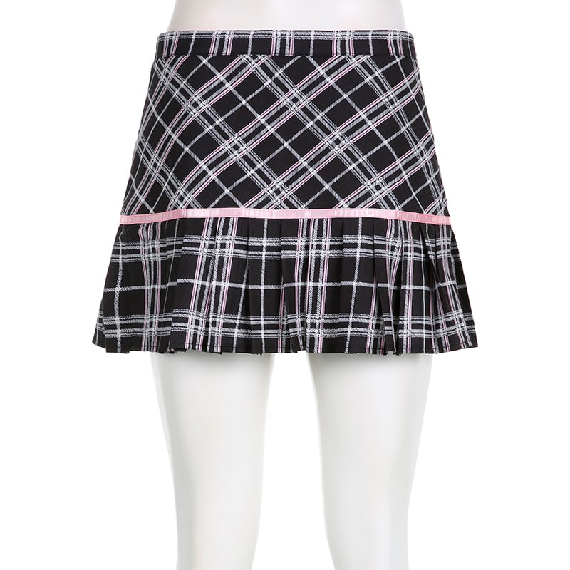 Pink Plaid Stripe Pleated High Waist Mini Skirt