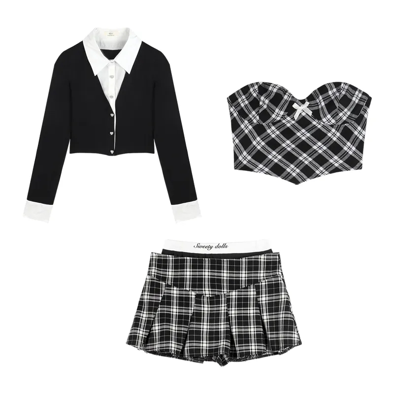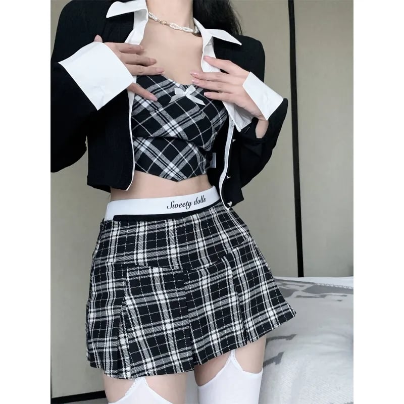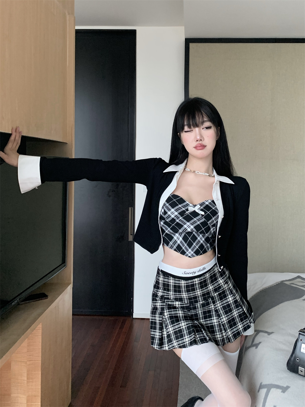 3PCS Plaid Patchwork Camisole + Pleated Skirt + Long Sleeve Shirt