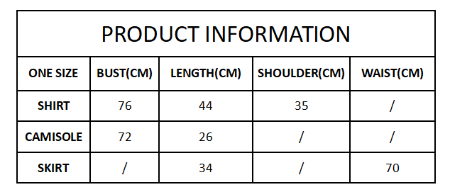 100% Brand New and High Quality . Material: Polyester, Cotton . Size: Available in images. Includes: Camisole + Jacket + Skirt.