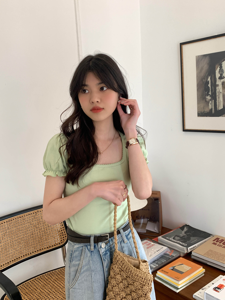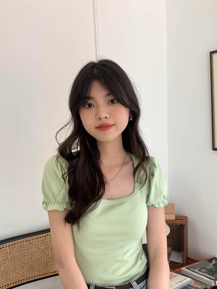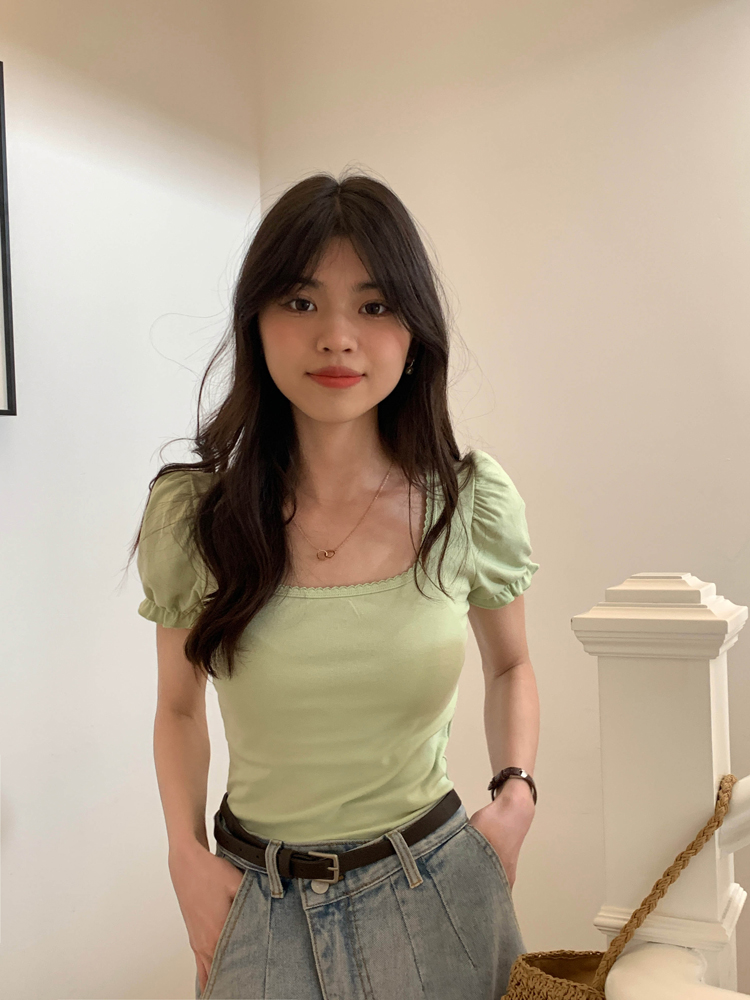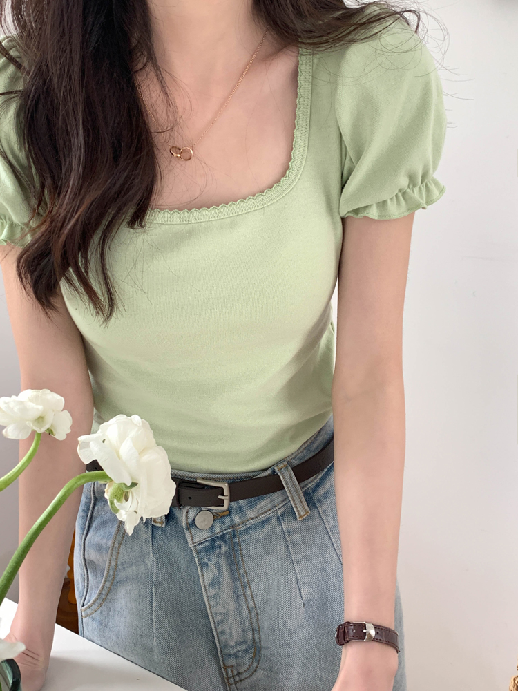 Green Puff Sleeve Square Collar Top