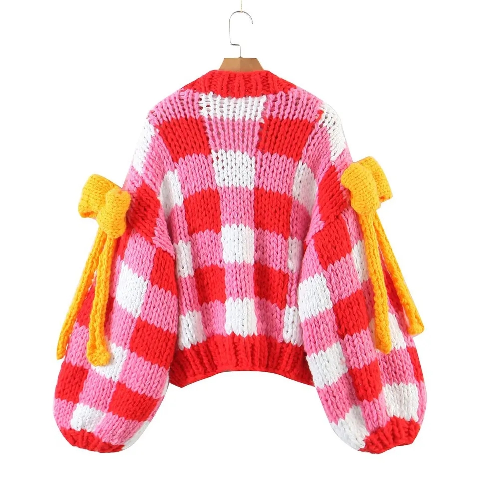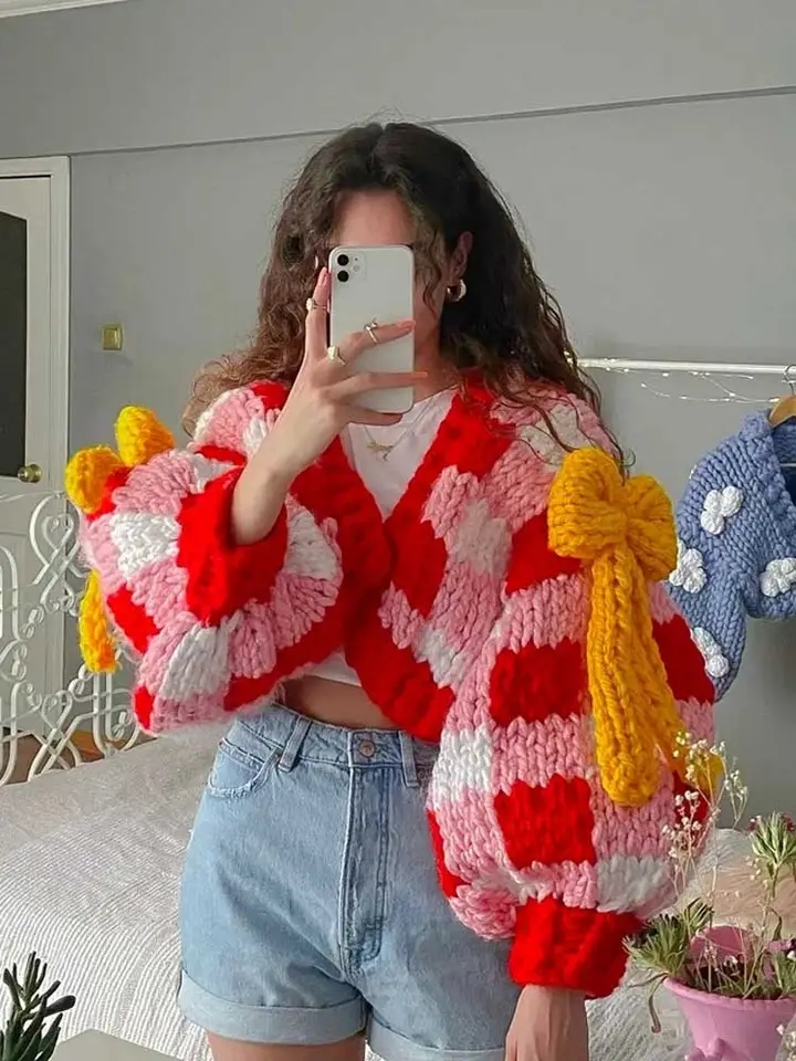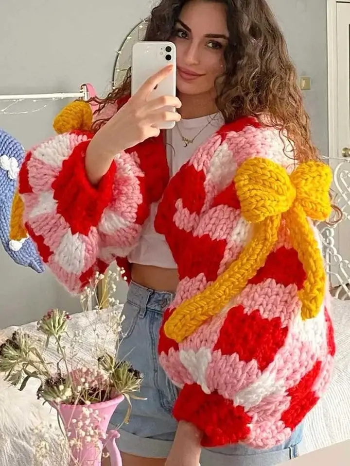 3D Red & White Crochet Cardigan with Yellow Bow