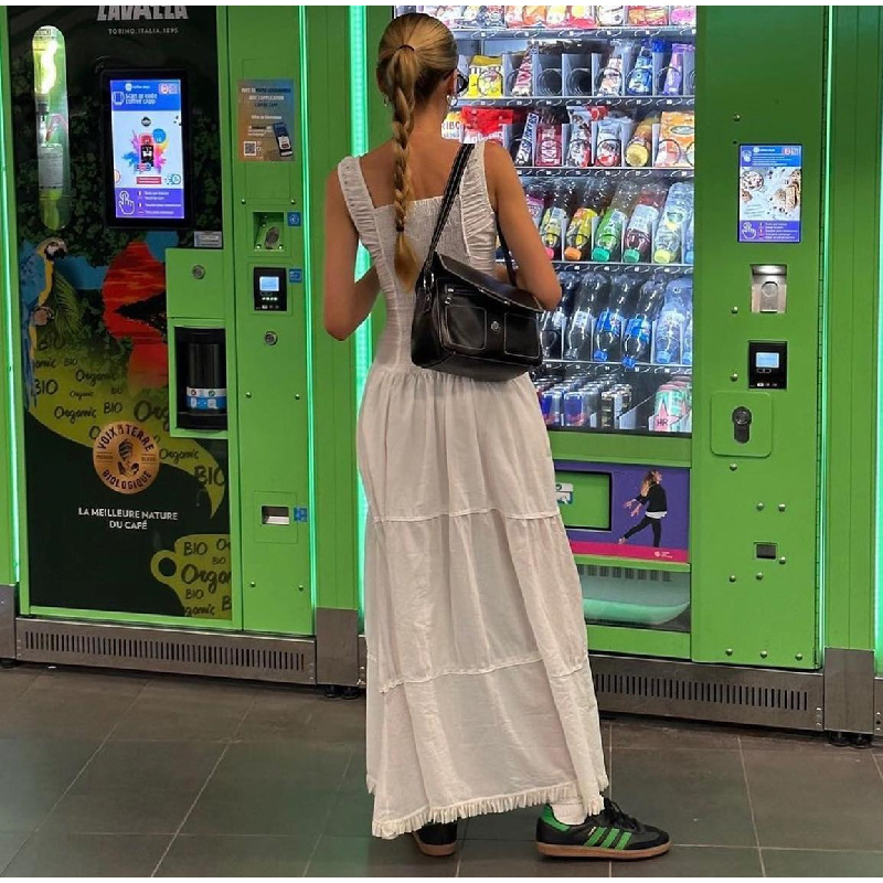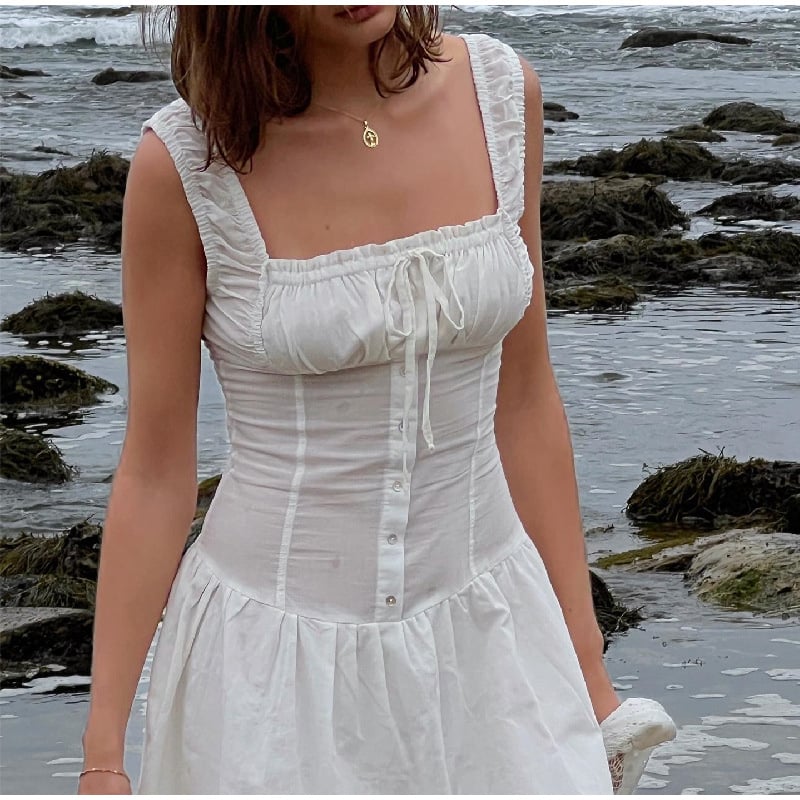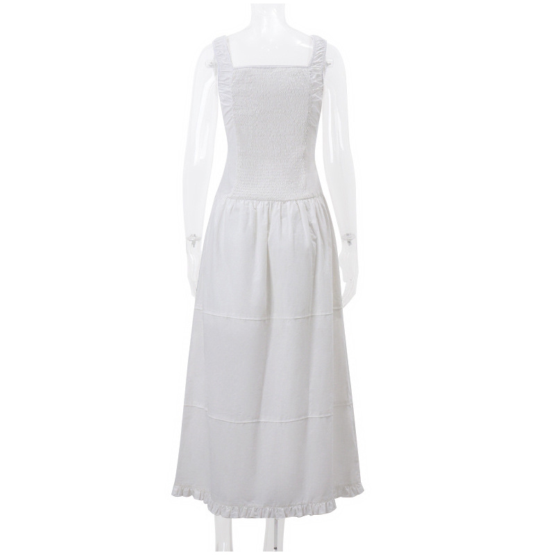 White Pleated Lace Up Square Collar Ruffle Maxi Dress