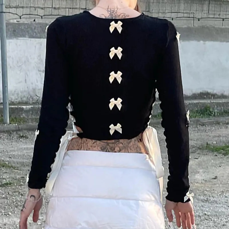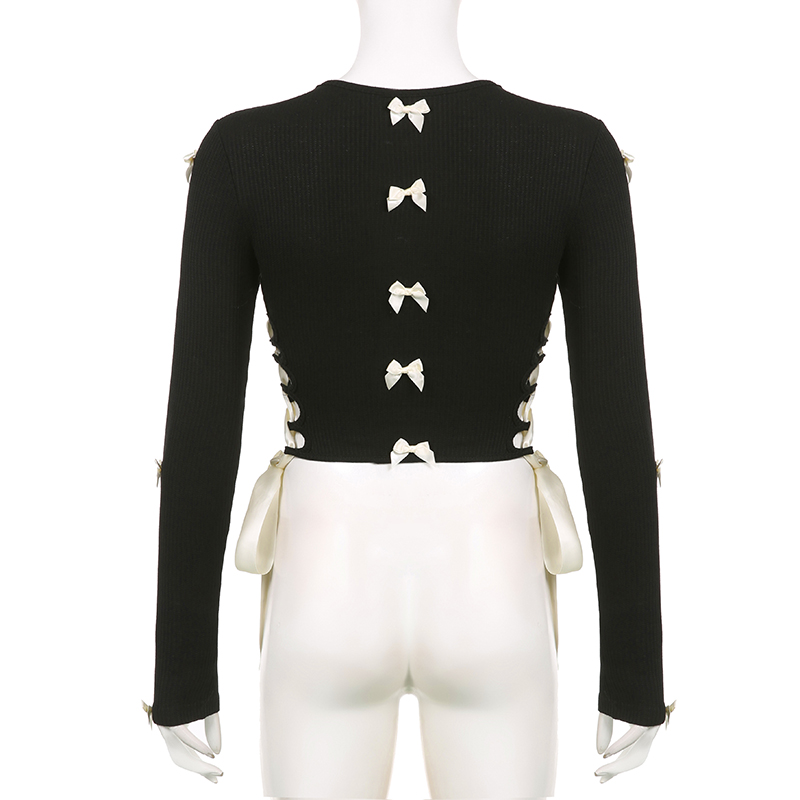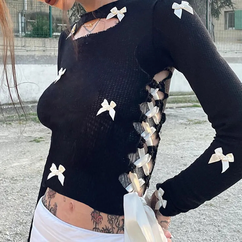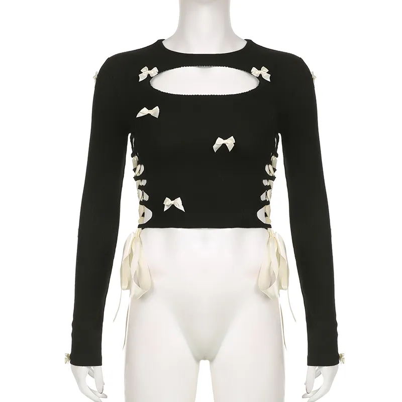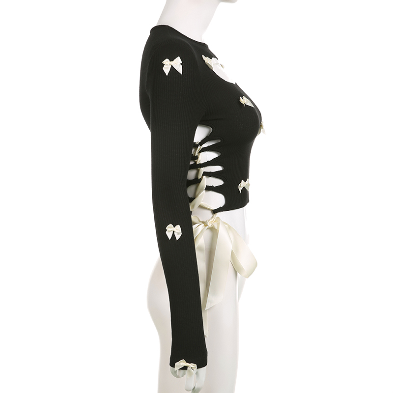 Black Bow Ribbon Hollow Out Knit Long Sleeve Shirt
