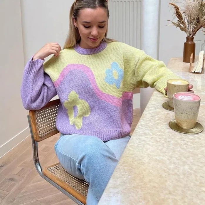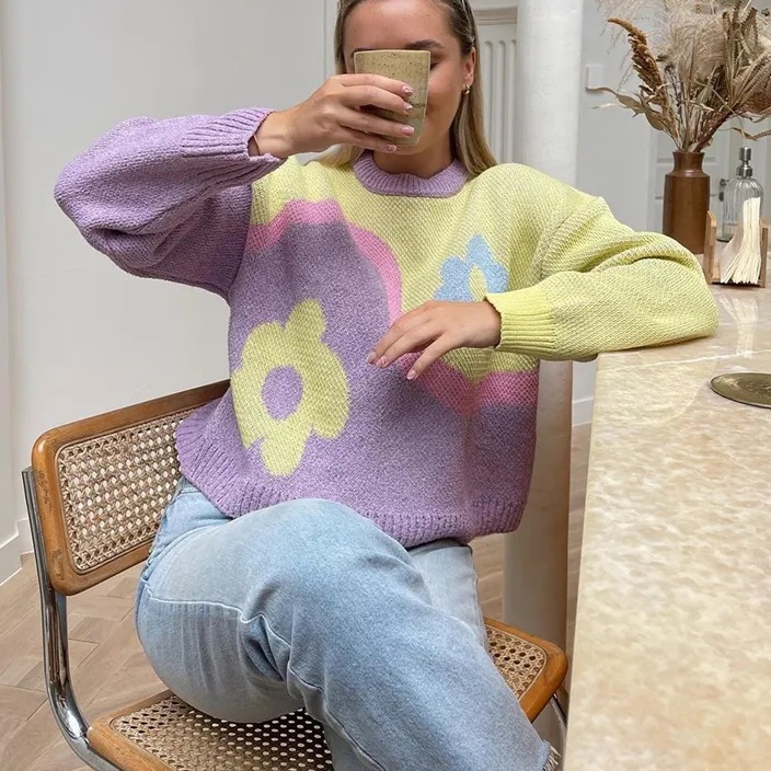 Purple & Yellow Flower Print Patchwork Sweater