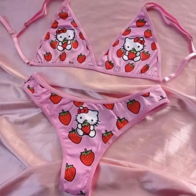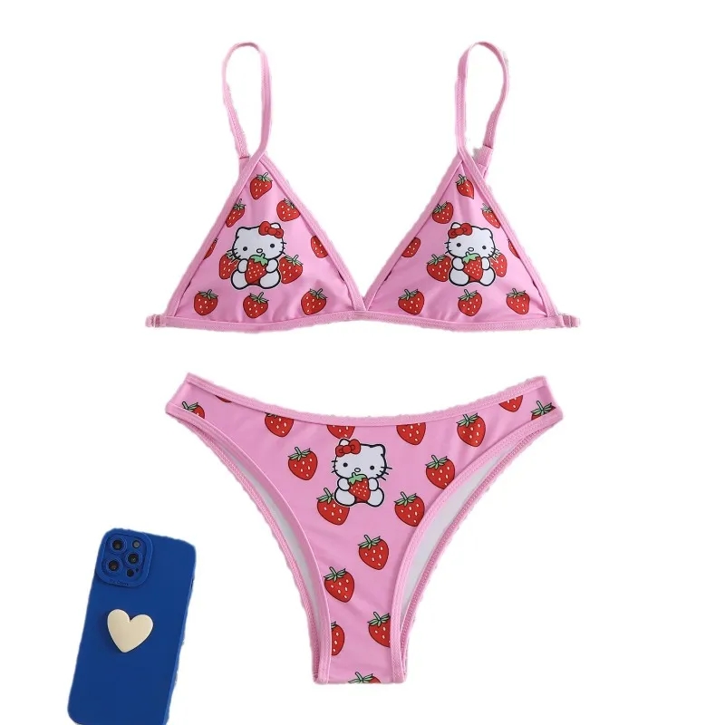 2PCS Pink Strawberry Japanese Cat Bikini Set