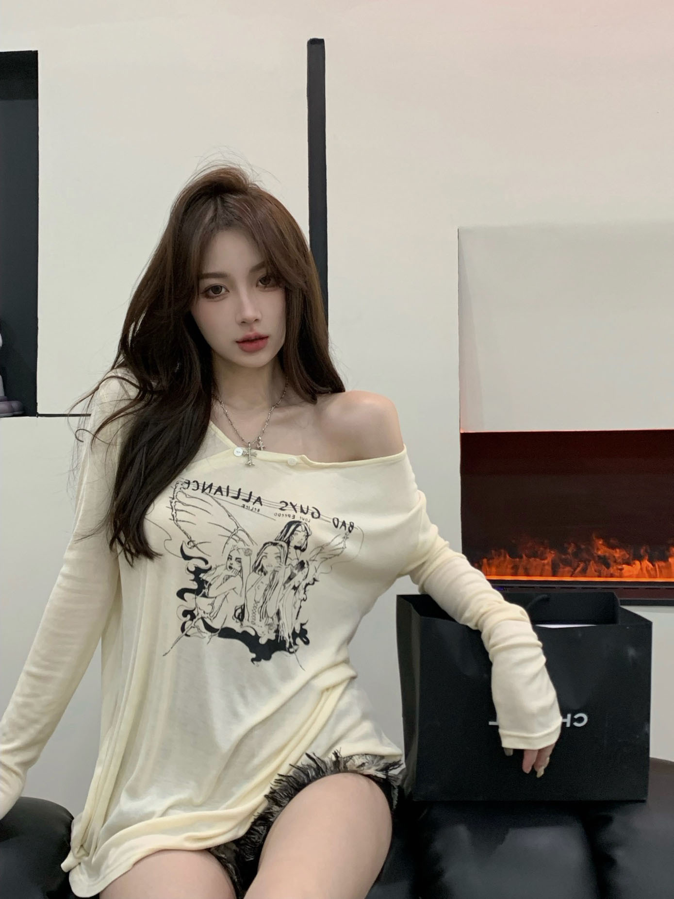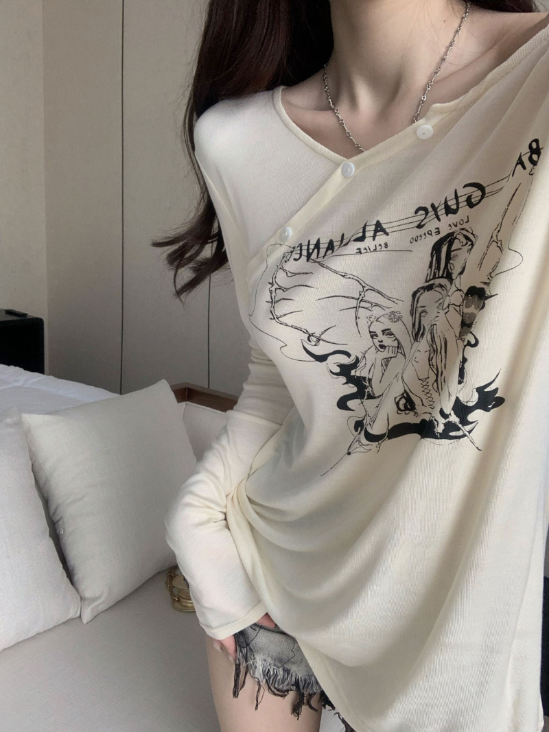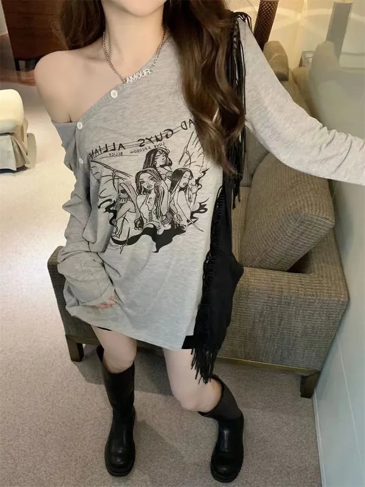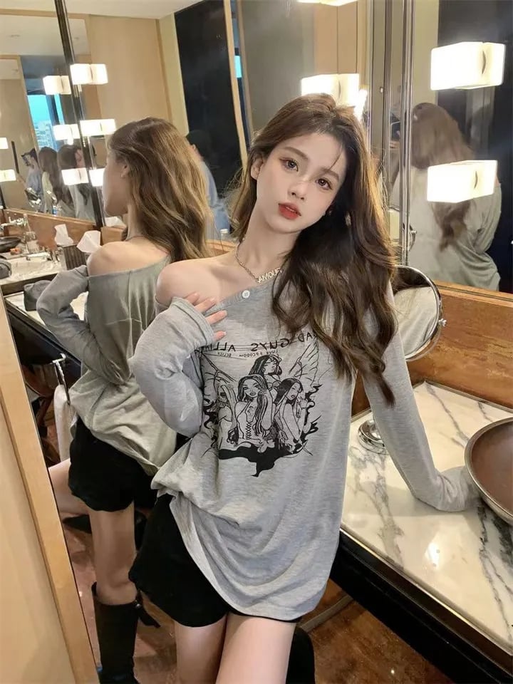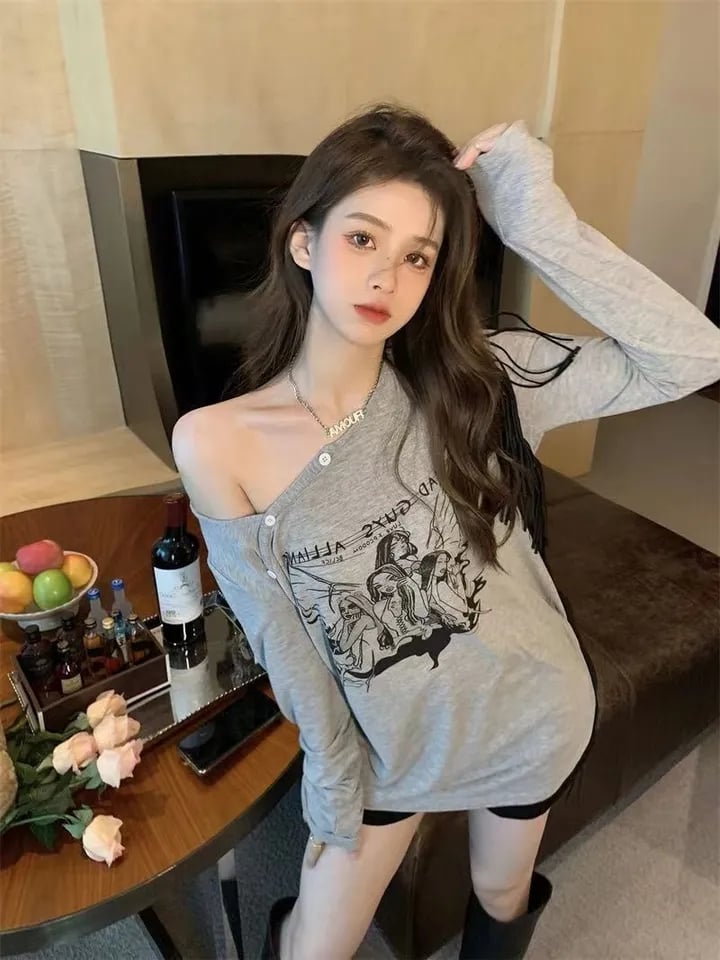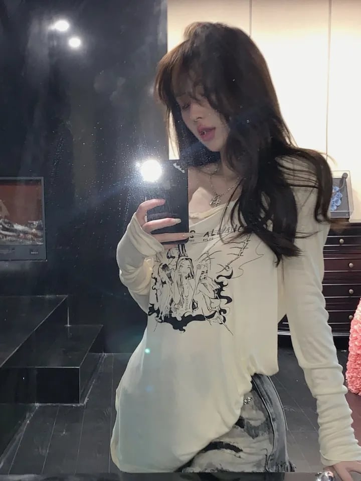 Cute Sexy 2pcs Moon Print Long Sleeve T-shirt Crop Top With Bra Camisole Summer Aesthetic Casual E-Girl Kawaii Korean Japanese Harajuku