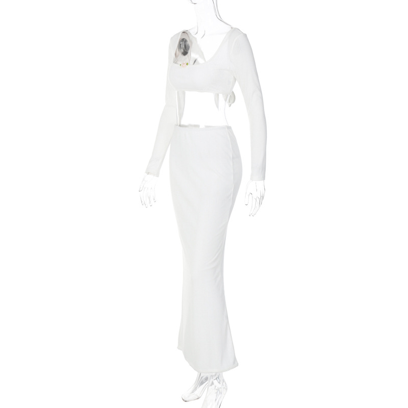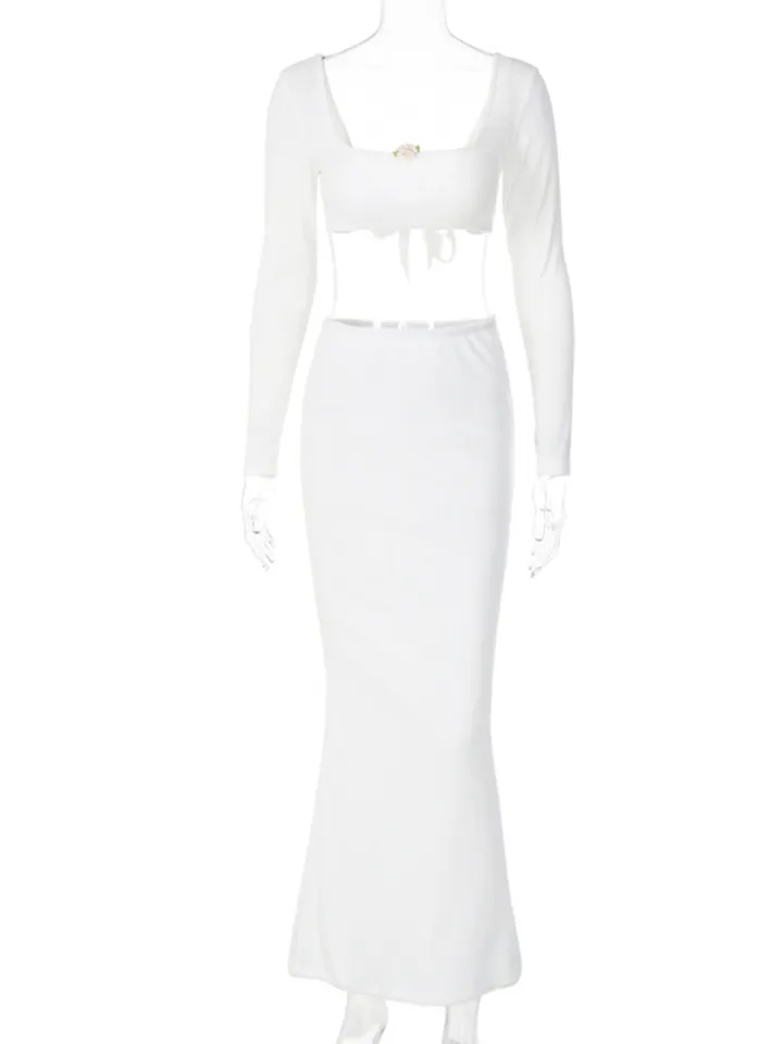 2PCS White Rose Long Sleeve Crop Top + Maxi Skirt