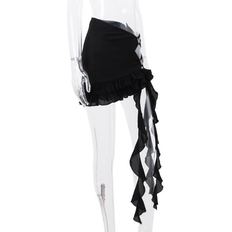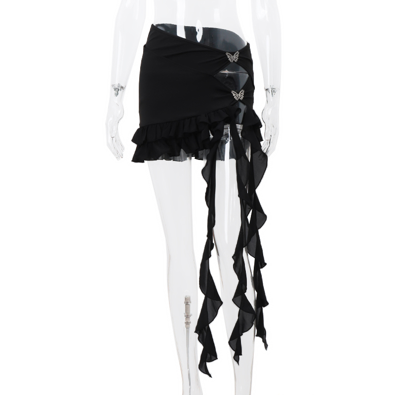 Black Butterfly Ruffle Hollow Out Split Mini Skirt