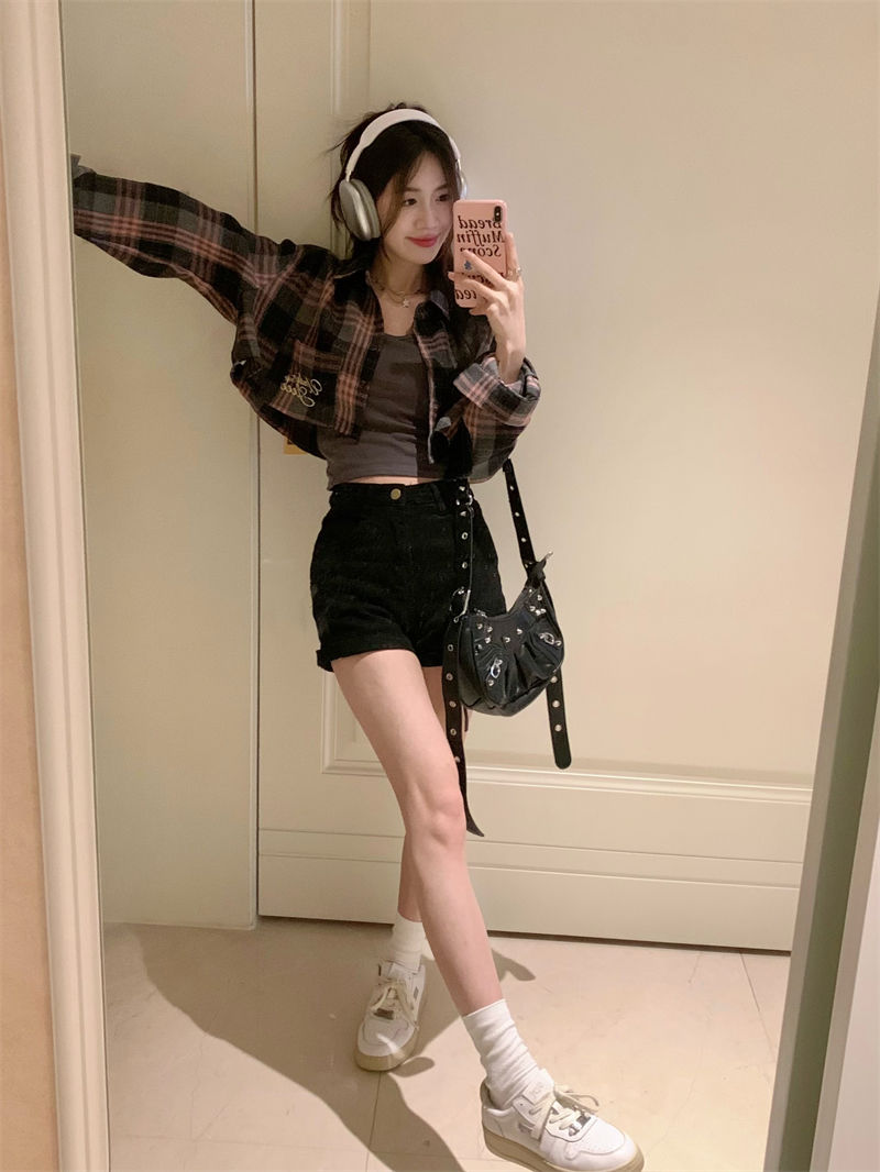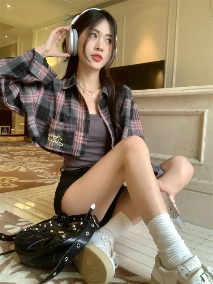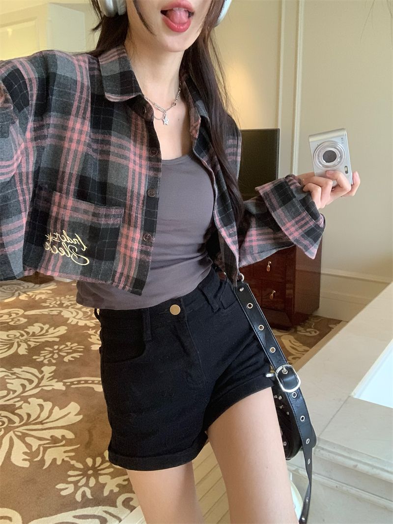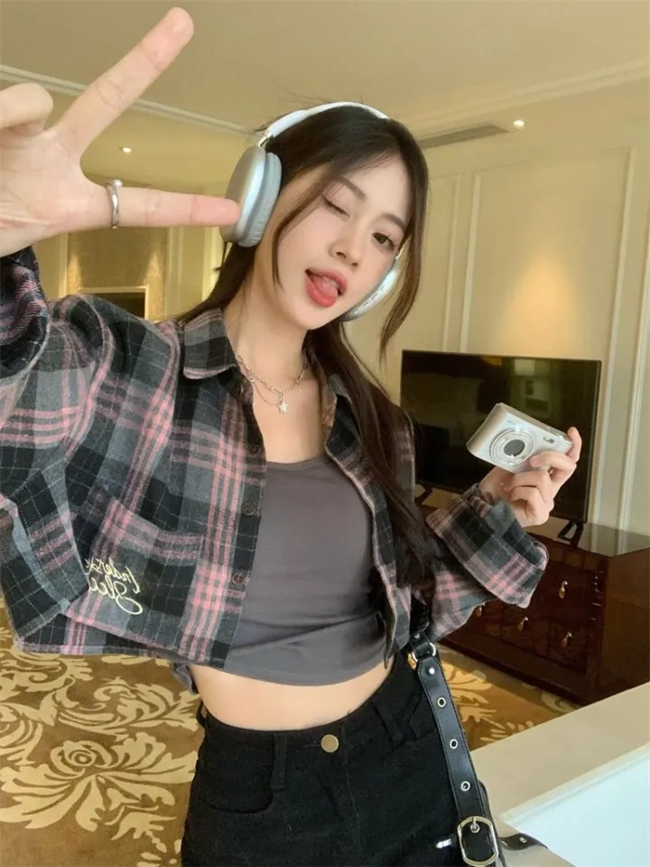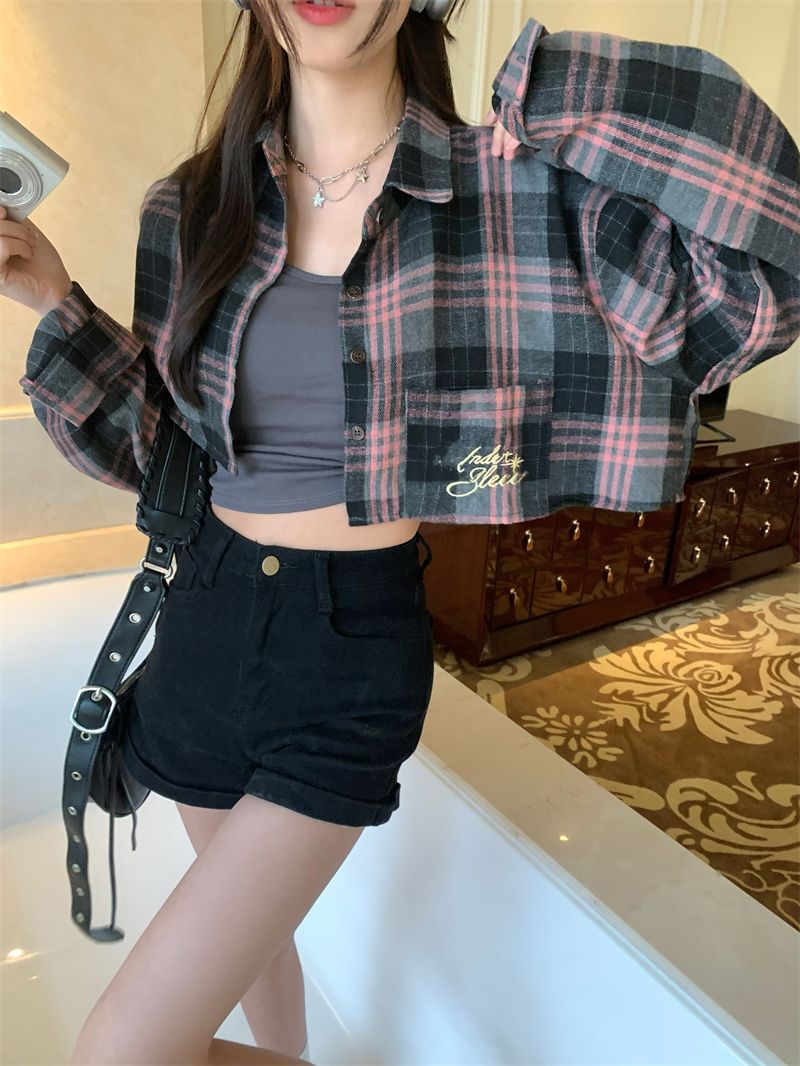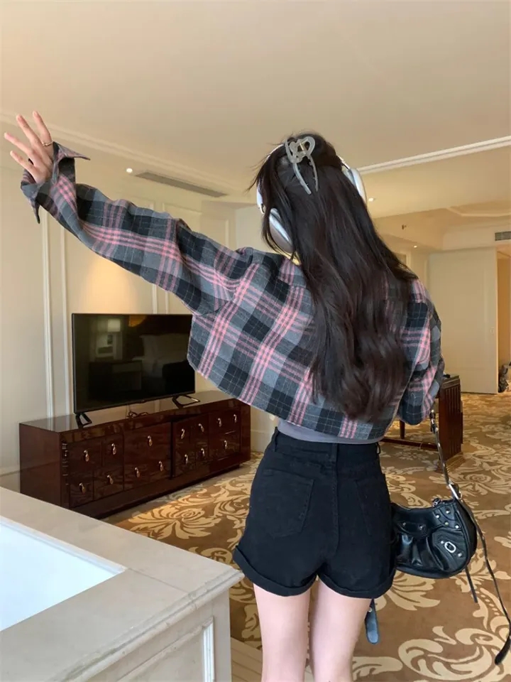 Pink & Black Plaid Cropped Long Sleeve Shirt