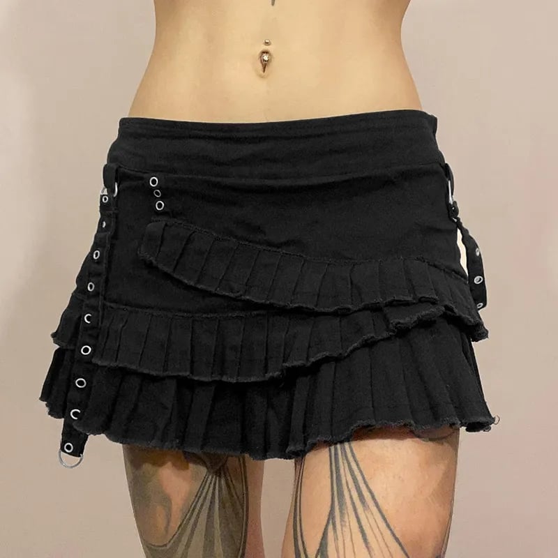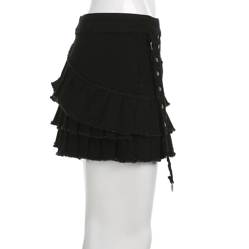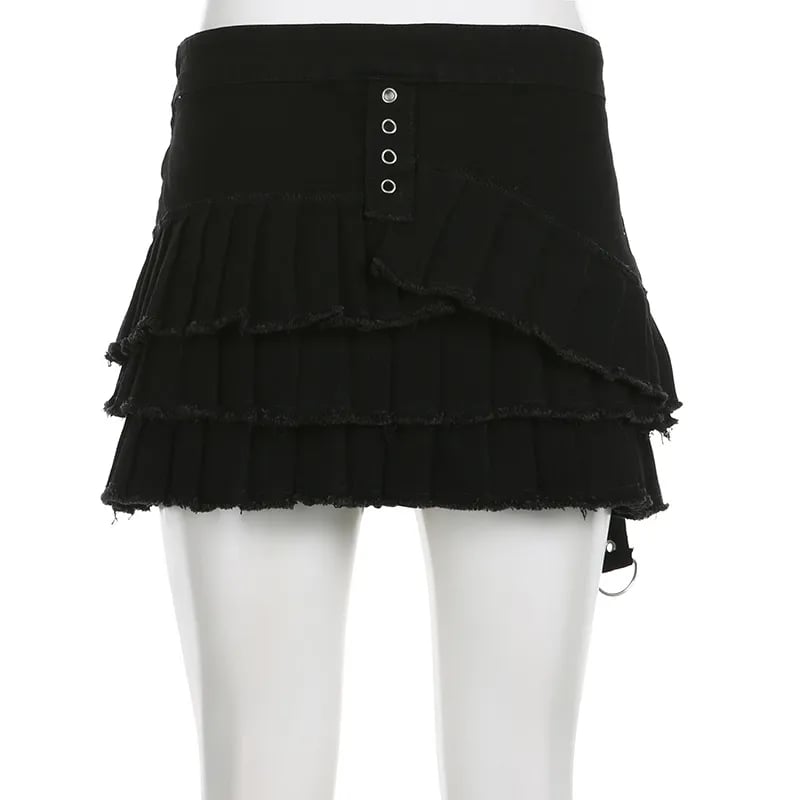 Black Denim Pleated Low Waist Irregular Mini Skirt
