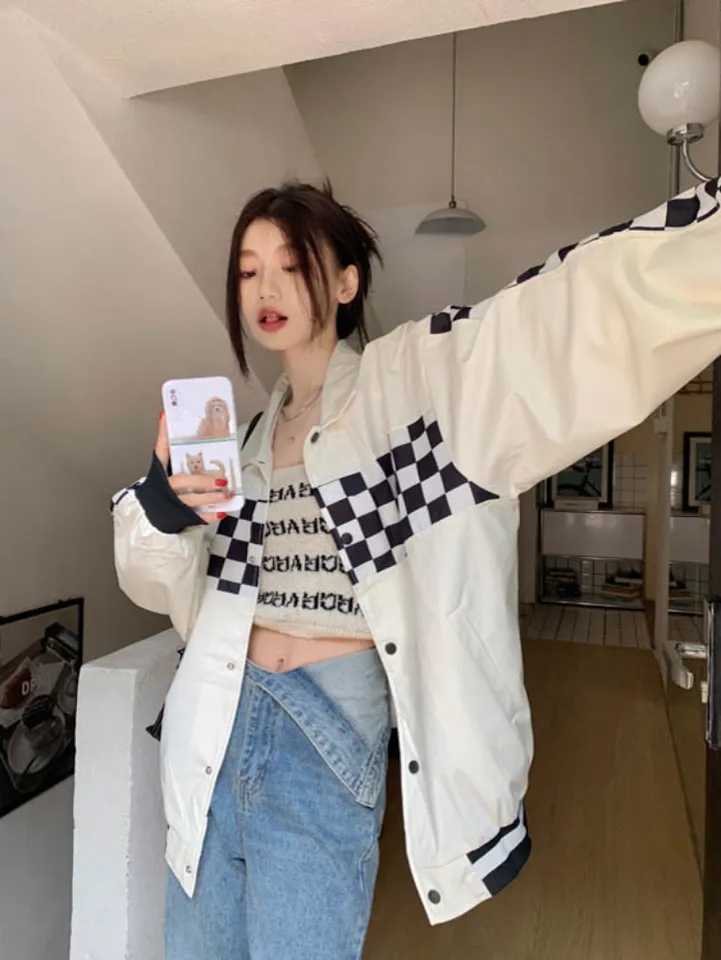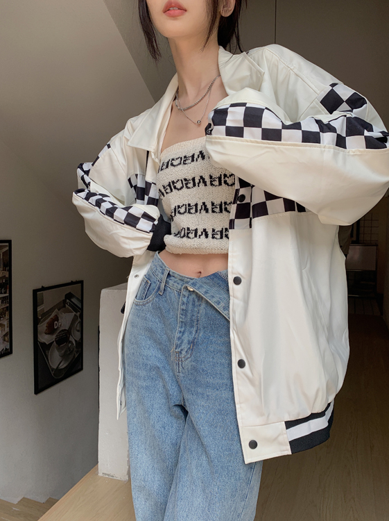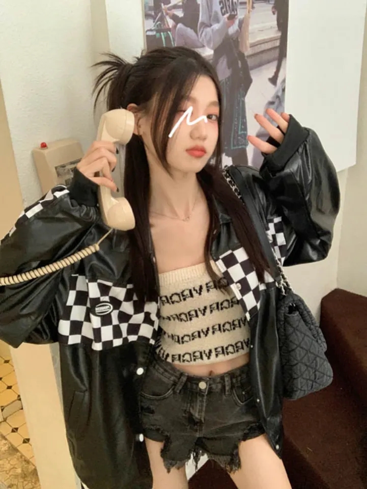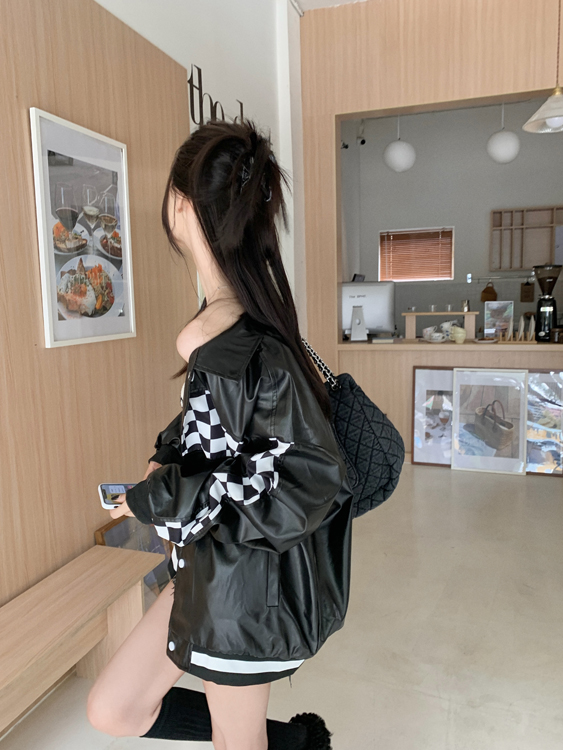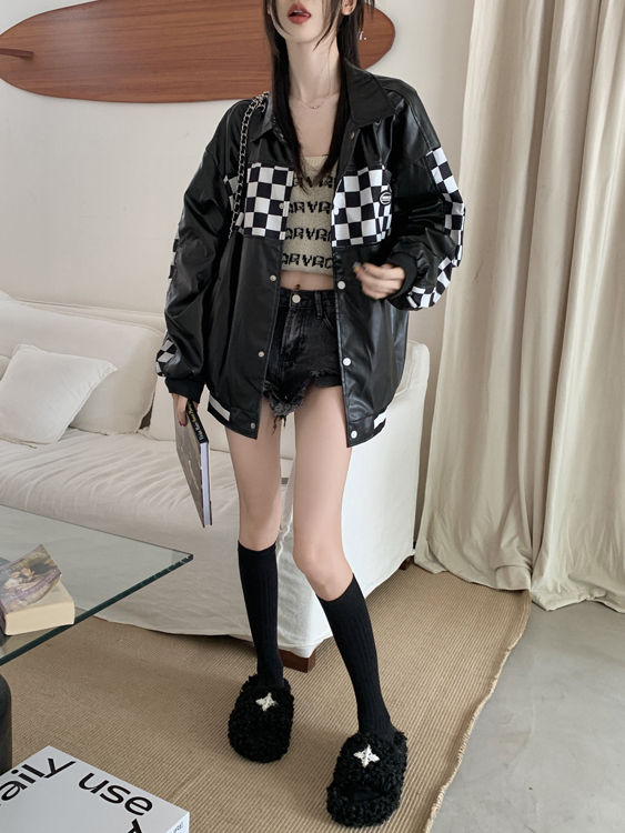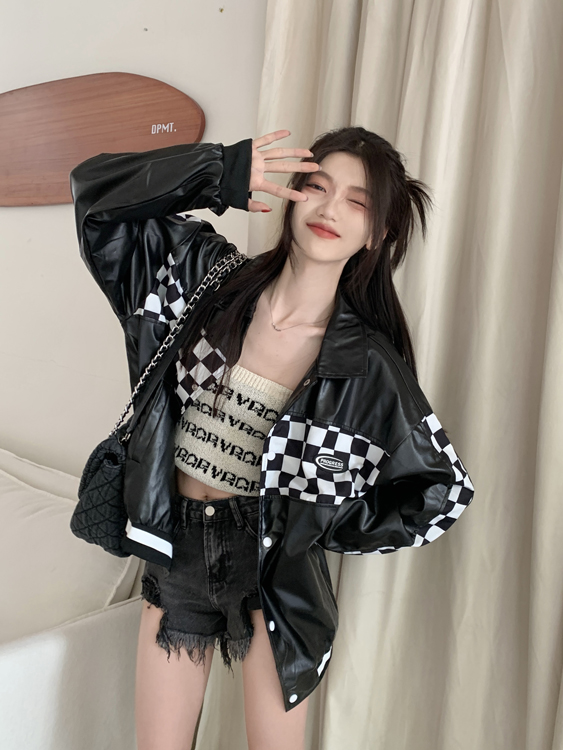 Black PU Leather Checkboard Loose Jacket