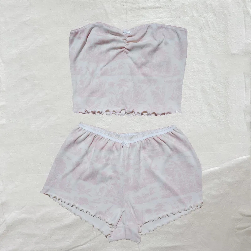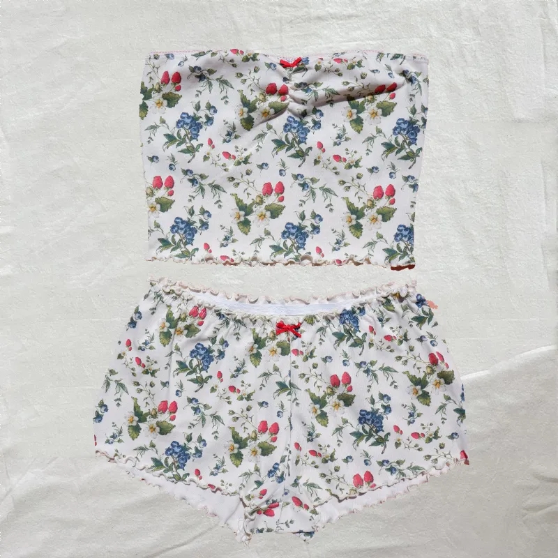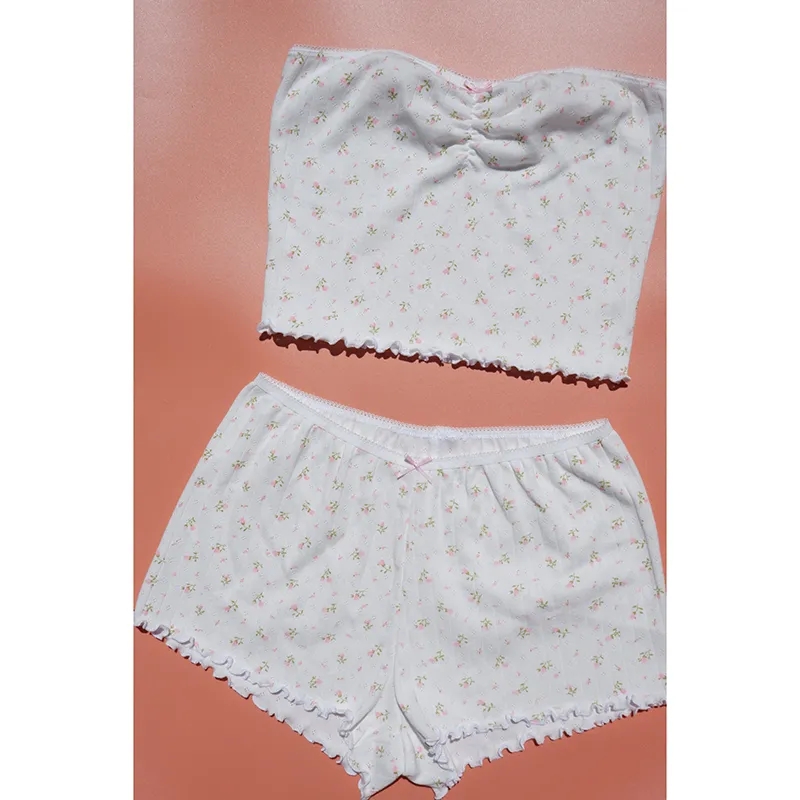 2PCS Pink Floral Print Frill Strapless Top + Shorts Set
