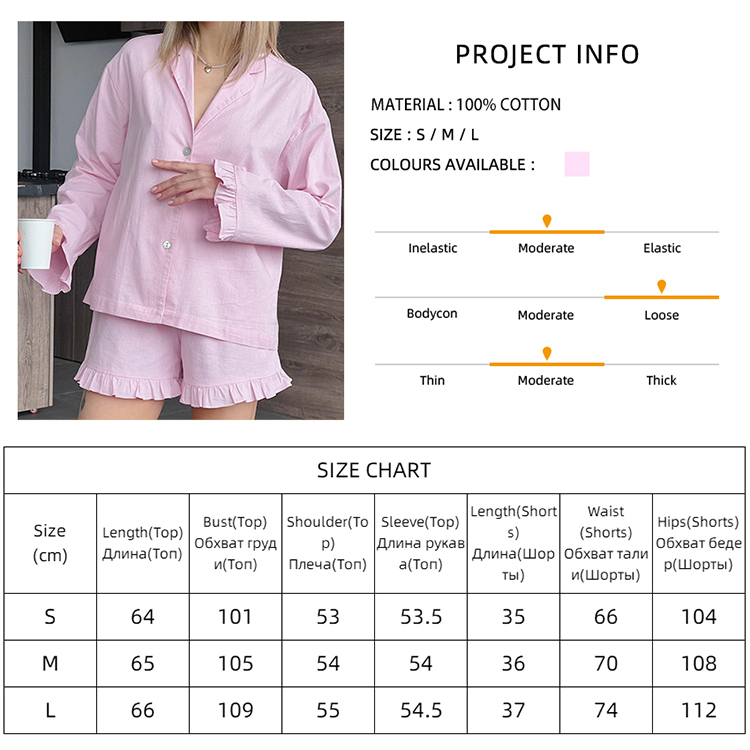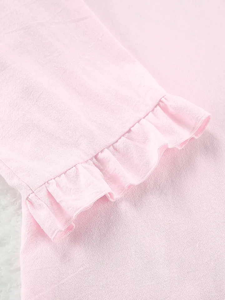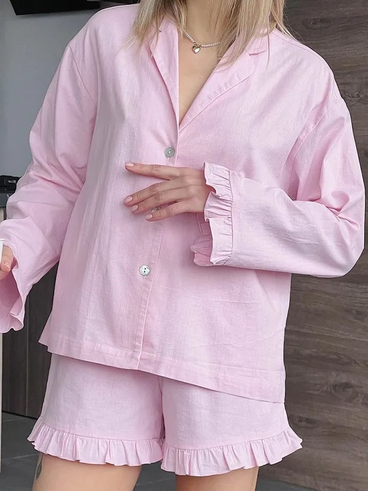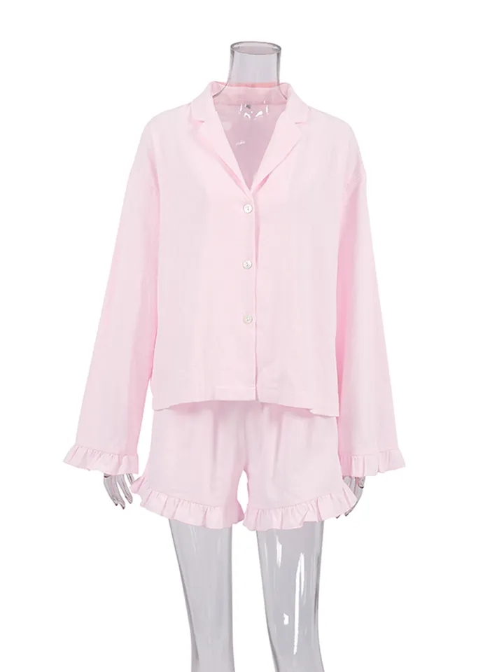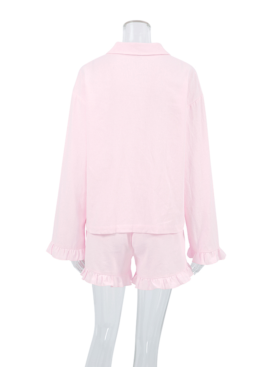 2PCS Pink Ruffle Long Sleeve Shirt + Shorts Pajama Set