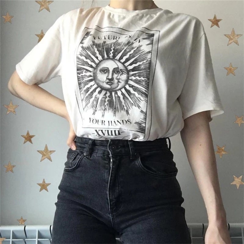Cute Tarot Card Sun Moon Print Short Sleeve Shirt T-shirt Tee Top Kawaii Korean Japanese Harajuku Chinese Retro Streetwear Aesthetic Fashion