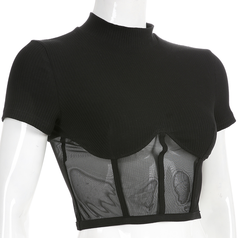 Cute Sexy Patchwork Black Mesh Crop Top Short Sleeve Shirt Tee T-shirt E-Girl Kawaii Korean Japanese Harajuku Chinese Retro Streetwear Aesthetic